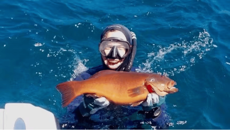 Fig. 1. Spearfisher Derrick Cruz, pictured with a coral trout (Plectropomus leopardus) caught off eastern Australia’s temperate coastline. This is an example of an observation poleward of the species historical distribution limit that was logged with Redmap.