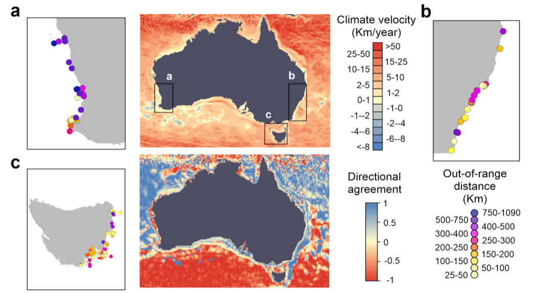 Fig. 3. The velocity of climate change, its directional agreement with ocean surface currents, and the locations of out-of-range observations. The velocity of climate change and its directional agreement with average mean annual surface currents. Inset panels show the out-of-range observations from (a) western Australia, (b) eastern Australia and (c) Tasmania (n = 127) coloured by their corresponding maximum annual coastal extension distances relative to the historical southern distribution limit of each species.