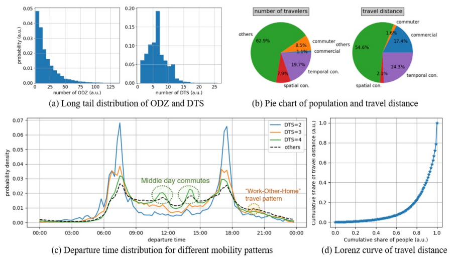 Experiments have shown that this data reveals that the distribution of flow on the main roads during the morning rush hour in the city is radial, and through correlation calculation, it is found that this data has high consistency with other data sources in terms of cross-section flow and road travel time. In addition, the holographic traffic flow also reflects the day-night characteristics of traffic flow operation, such as lower vehicle speeds at night, which is consistent with prior knowledge. From the perspective of travel, by statistically analyzing individual travel times, it is possible to clearly distinguish different populations with different travel patterns (Figure 1). Through specific statistical analysis of vehicle travel, it was found that 20% of vehicles in the city accounted for 80% of travel, which was verified by the Lorenz law.