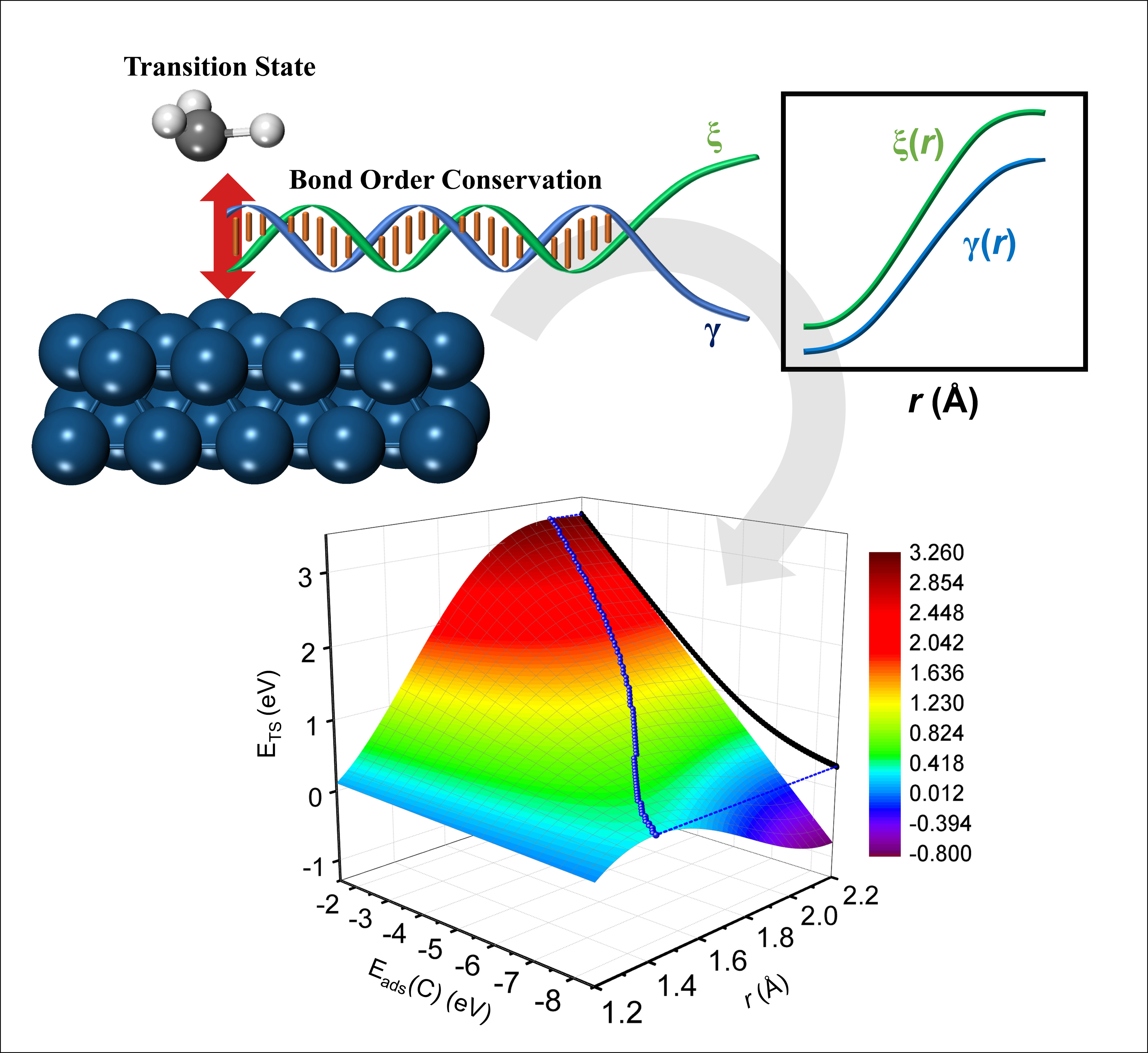 Image caption: Schematics showing how unique functions gamma and xi determined through a bond order conservation approach can be linked to the estimation of activation energies important in chemical reactions on heterogeneous surfaces.