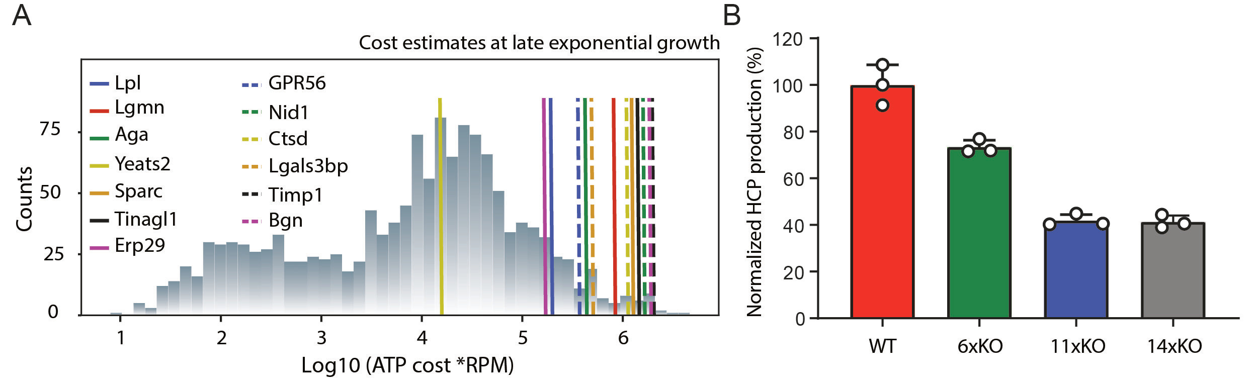 Figure 2. A The selected targets exert a greater cost to the cell and B HCP content is decreased strongly in the knockout cell lines.