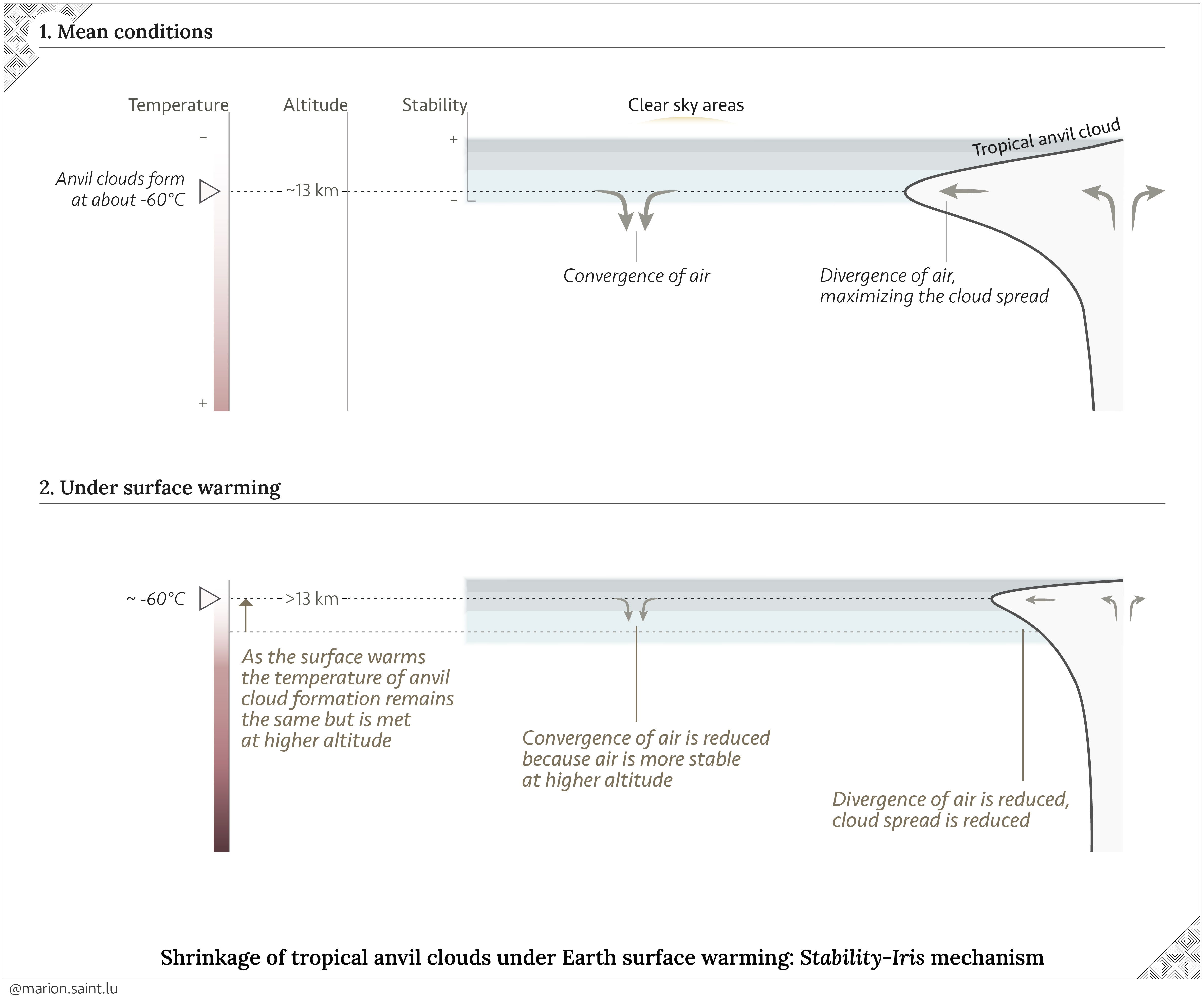 The clear-sky-anvil relationship has been invoked before in the framework of the “stability-Iris” mechanism, predicting that the anvil horizontal spread decreases when the surface of the Earth warms. As the surface warms, there is an upward shift of the maximum of horizontal air convergence in clear-sky areas, and hence a corresponding upward shift of anvil clouds. The stability-Iris mechanism states that this upward shift reduces the magnitude of air convergence, because the atmosphere is more stable at higher altitude, which means that vertical motions are suppressed. By mass conservation, this acts to reduce the anvil horizontal spread.