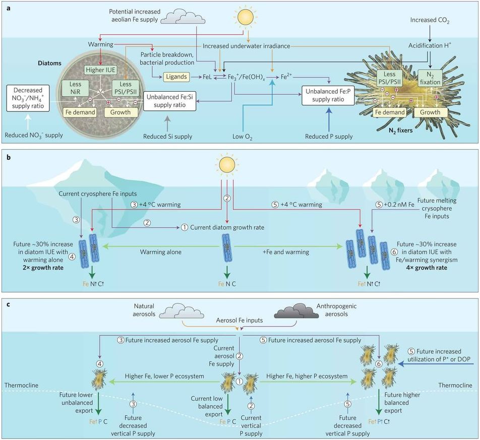 Changes in the ocean, such as acidification, stratification, warming and deoxygenation, affect the iron biogeochemical cycle, which in turns impacts on phytoplankton growth. This Perspective discusses what research is needed to predict the future marine iron cycle.