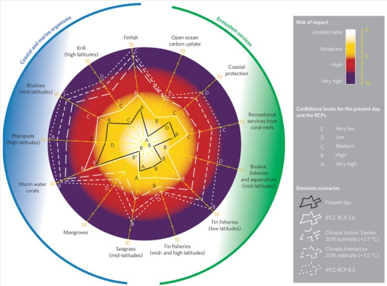 In advance of the 2015 Paris climate meeting, scientists assessed the risks of impacts on the ocean arising from past and future cumulative carbon emissions. This Commentary reviews aggregated risks for selected temperature thresholds, including the below +2 degree celcius target and for pathways derived from countries' emission commitments. Results suggest that even low emissions will result in a large increase in impacts on the ocean compared to today.