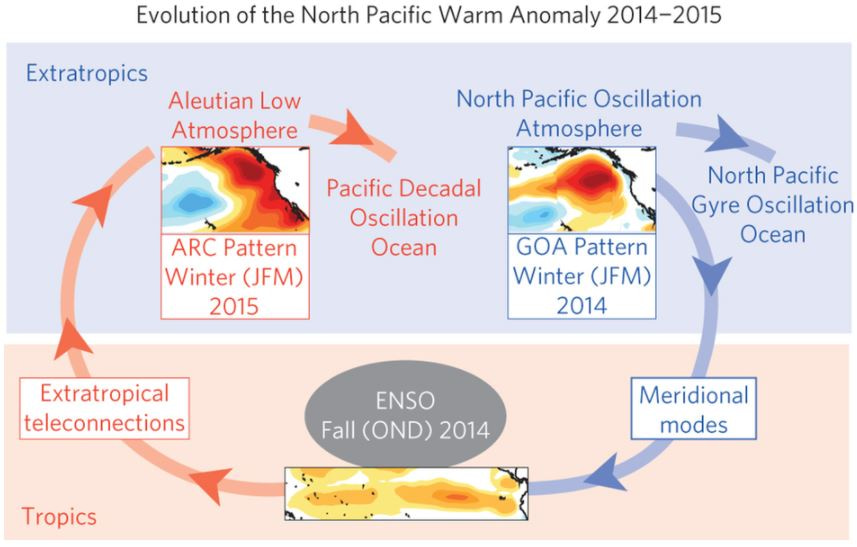 Over 2013-2015, a strong marine heatwave was observed in the northeast Pacific Ocean, affecting drought conditions across the western US coast and impacting fisheries. This Article summarises the atmosphere-ocean interactions and corresponding teleconnections that drove the persistence of anomalously warm sea surface temperatures.
