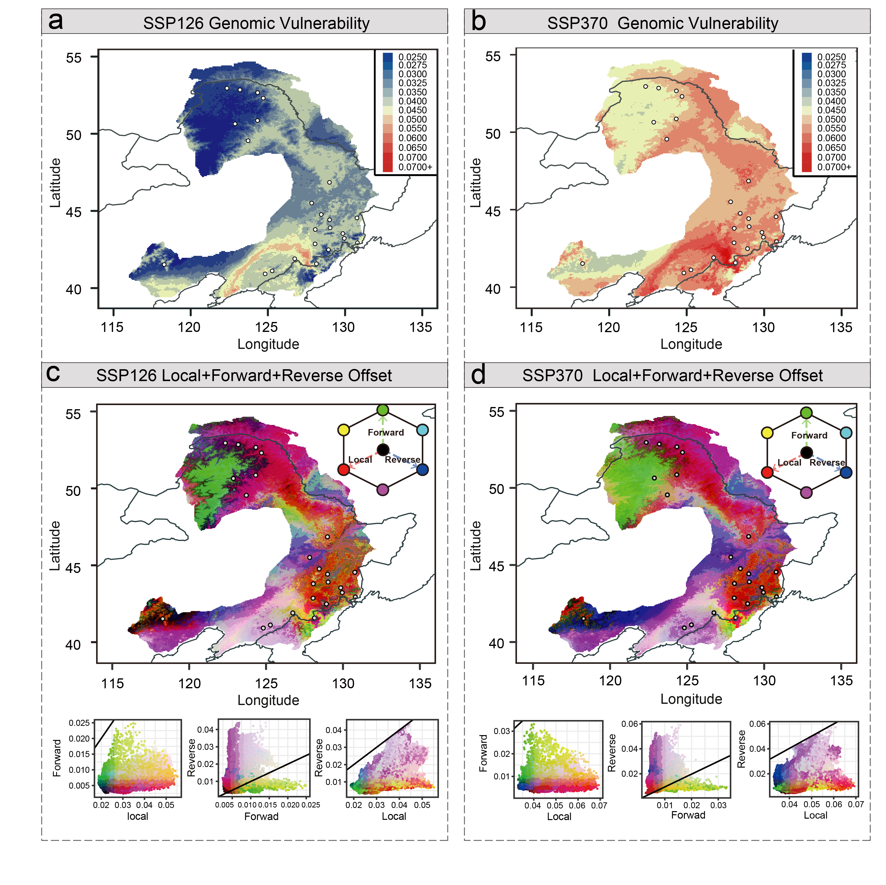 Based on the established contemporary genotype–environment relationships and the identified climate-associated genetic loci, we further predict how populations of P. koreana will respond to future climate change. We used various complementary approaches, including both single-locus-based (RONA), multi-locus-based (GF) as well as models that integrate migration into the analyses, to investigate the spatial pattern of maladaptation across the range of P. koreanaunder future climate conditions. All the results showed that a set of populations located in the southeastern part of the current distribution range are most likely to be vulnerable in the future. These populations, therefore, are needed to be conserved with special management strategies not only because of their high genomic offset to future climate change but also because they contained many unique, climate-adaptive genetic resources. Taken together, our findings highlight the importance of integrating genomic and environmental data to predict adaptive capacity of a key forest to rapid climate change in the future, and also identify many candidate genes and variants that may be useful for future forest tree breeding with special aims.