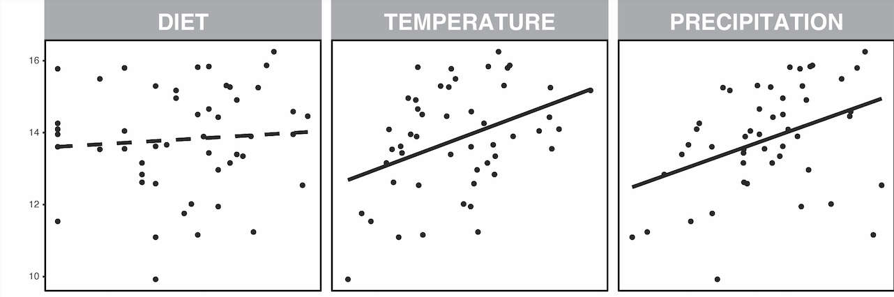 Surprises aside, our findings were revealing. Precipitation and temperature niche breadths were positively correlated with geographic range size even after accounting for the non-independent, phylogenetic relationship between species (failing to control for this could lead to artifacts!). However, diet breadth was not correlated with geographic range size, suggesting that species that can use multiple host species do not necessarily distribute themselves more widely. These findings provide mixed support for the range size-niche breadth hypothesis: on the one hand, it is supported in climatic niches but on the other hand, there are no support when it comes to diets (Fig 2; adapted from Caron et al. 2024; PLoS Negl. Trop. Dis [5]).
