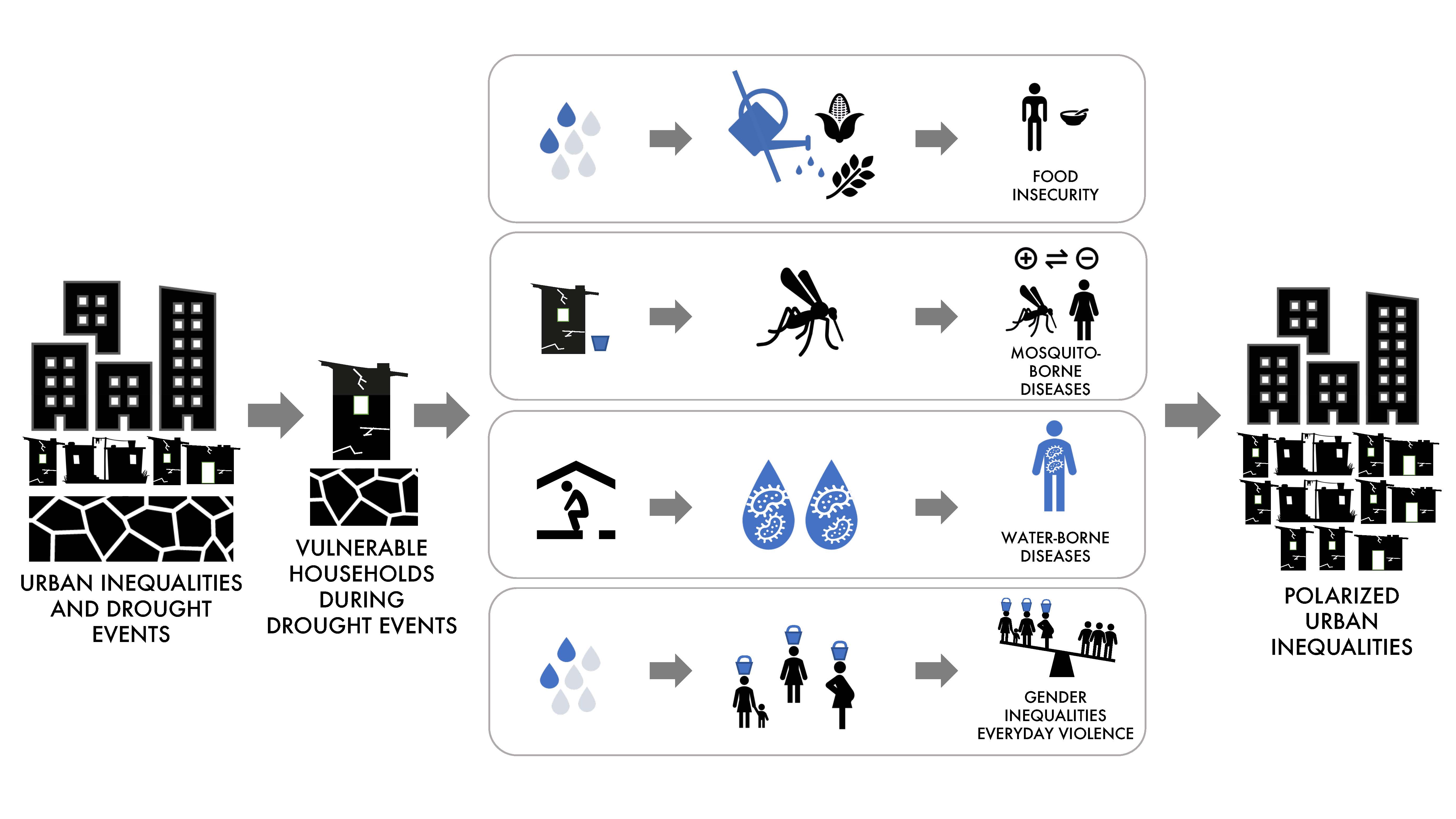 - Pillar 1: critical social science theories (political ecology, critical disaster studies, and environmental justice) on the genesis and uneven outcomes of urban droughts.