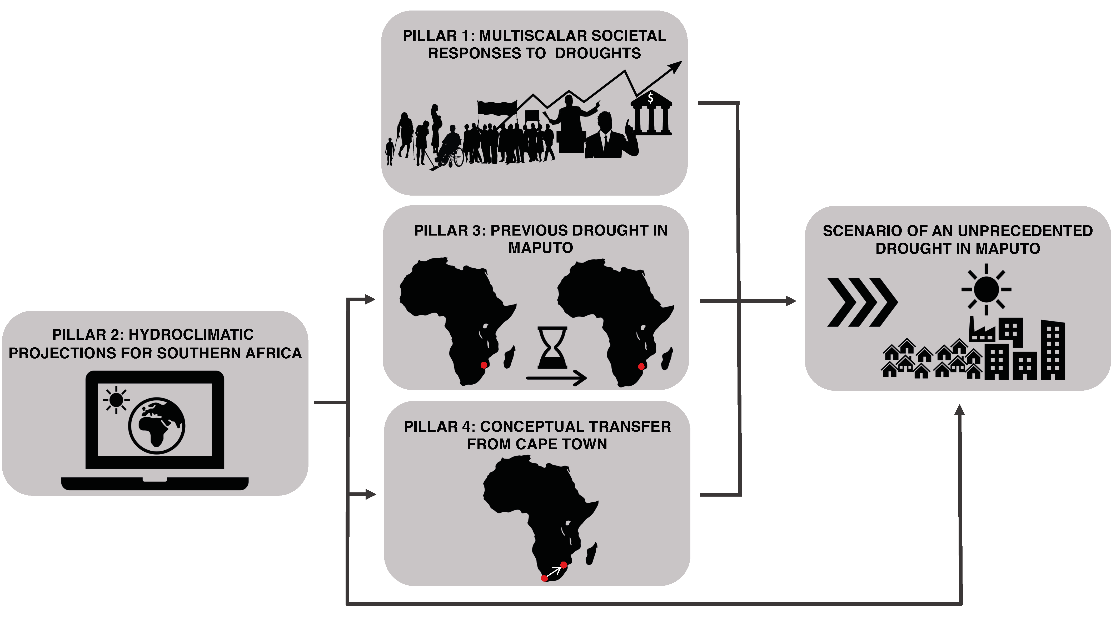 - Pillar 2: climate projections suggesting that a locally unprecedented drought in Maputo is plausible (Pillar 2).