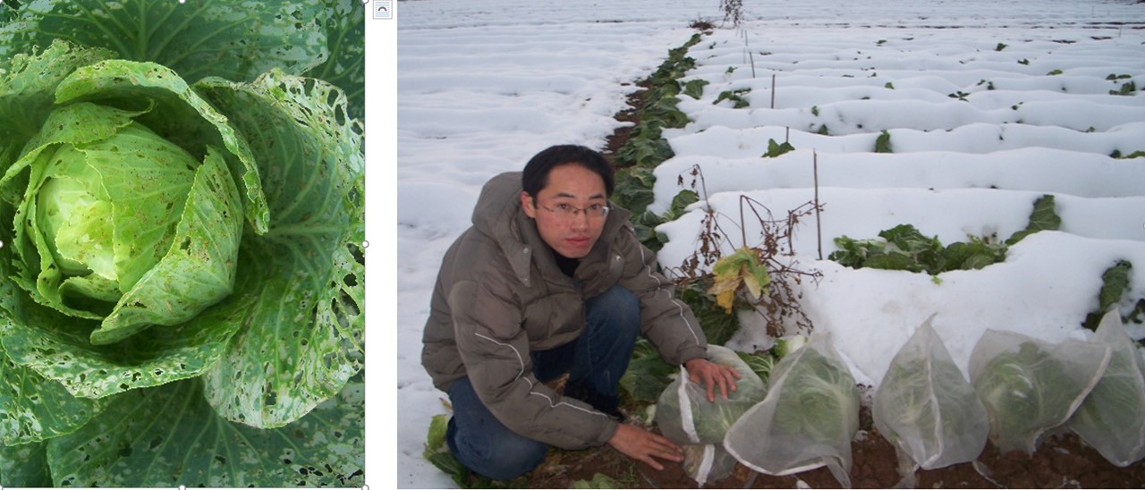 Damaged cabbage by the diamondback moth (left) and the field overwintering experiment (right)