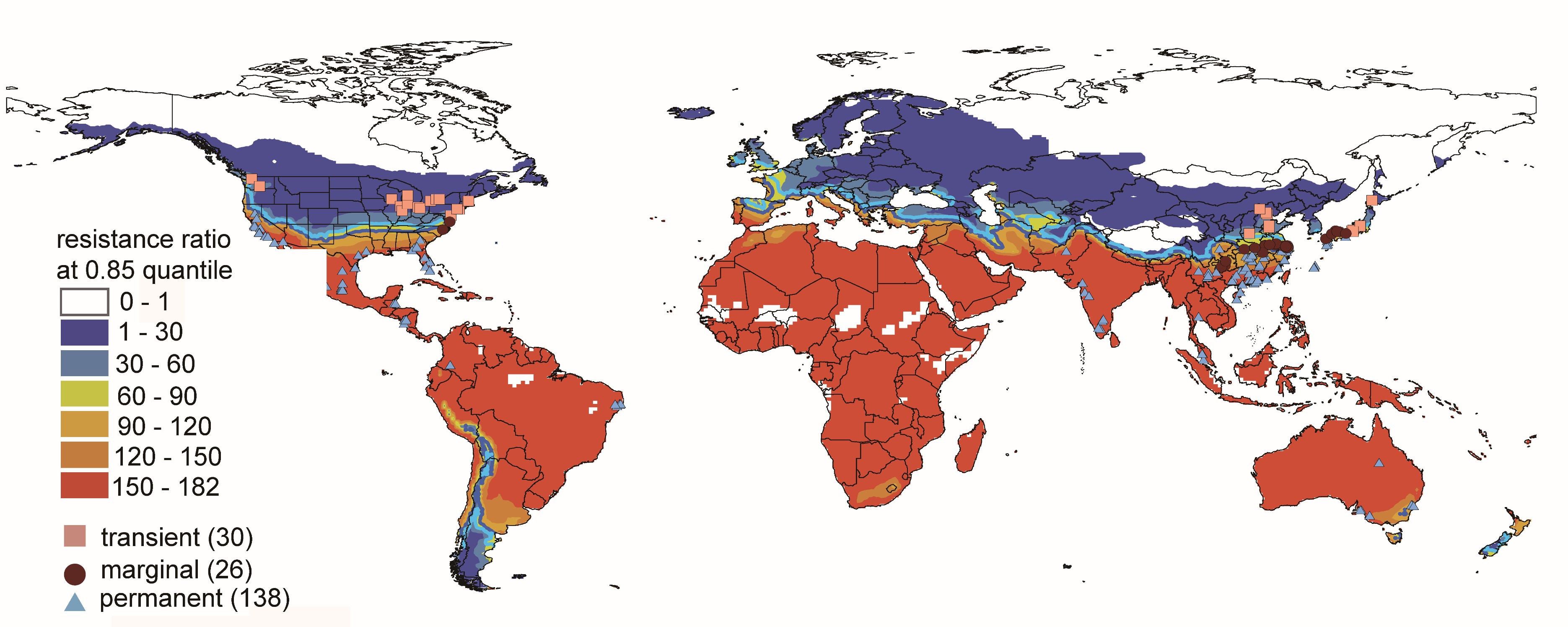 Pesticide resistance varies markedly from region to region due to different histories of insecticide application on the farm level, which could obscure the differences in statistics between different regions. However, stakeholders of pest control are especially concerned about high levels of pesticide resistance in their regions. Thus, we built quantile regression models driven by LTDD to predict the global distribution of resistance levels, especially we focused on the significant 0.85 quantile model for the distribution of the top 15% resistance levels in China and the world in 2012~2016. The meta-analysis of global datasets reveals that pesticide resistance levels are linked to the species’ overwintering range. By facilitating local persistence all year round, climate change can promote and expand pesticide resistance of this destructive species globally.