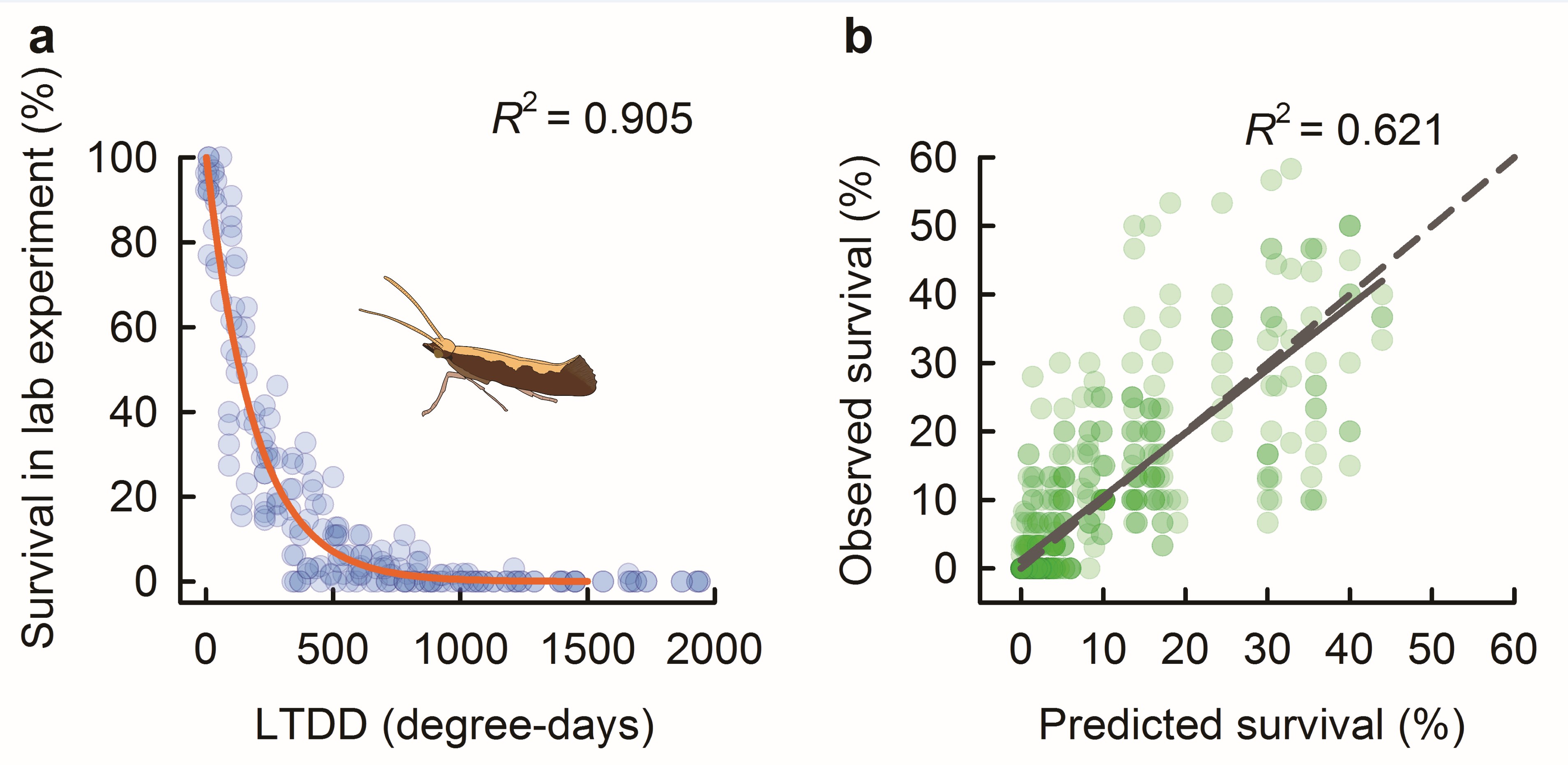In 2015, we invited Dr. Volker Rudolf from Rice University to visit our lab. We discussed the potential collaboration to work on this paper. To predict the global overwintering survival, together with Volker, we identified which metrics and models best-describe winter survival across a climatic gradient based on the laboratory results and finally found exponential model based on low temperature degree-days (LTDD) was the best. To validate winter survival models for field conditions, we compared model predictions to observed survivals in field experiments. We further extrapolated our winter survival predictions to a global scale under present and future climate scenarios. By analysing experimentally-parameterised and field-tested models, we show that climate change over the past 50 years increased the overwintering range worldwide.