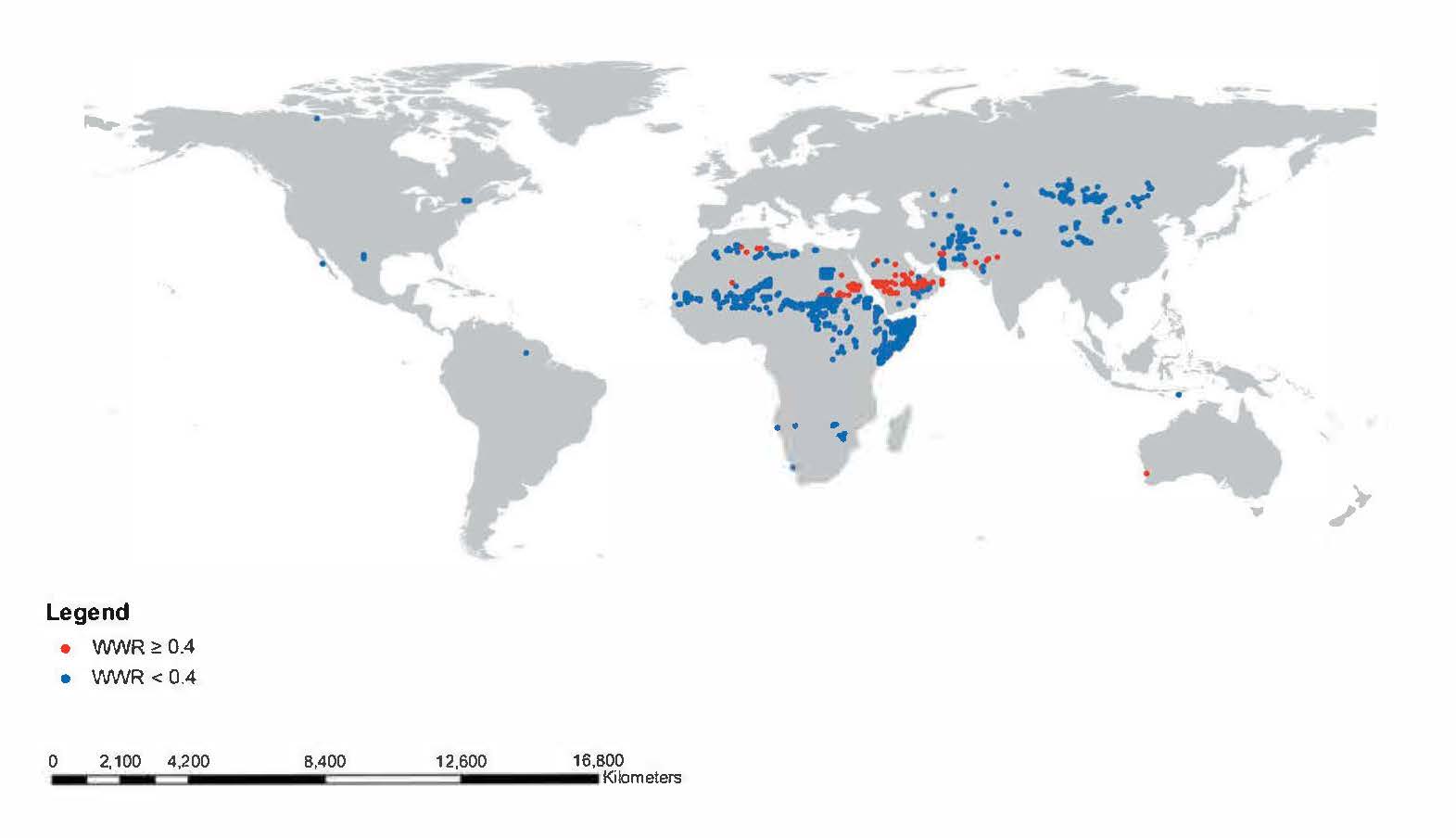 Recently, Oki and Quiocho (2020) refined the country-based analysis by Oki et al. (2017) and identified the most vulnerable populations, approximately 41 million, facing water crisis using high-resolution precipitation, GDP, freshwater availability and withdrawal (Figure 3). Blue and red dots correspond to the longitudinal and latitudinal grid boxes (0.5° × 0.5°) showing areas of both economically poor and water-scarce locations below the threshold line (connecting USD 10,000 of GDP-PPP per capita and 10,000 m3 of available freshwater per capita per year) with withdrawal-to-water ratio (WWR) less than 0.4 and more than 0.4, respectively.