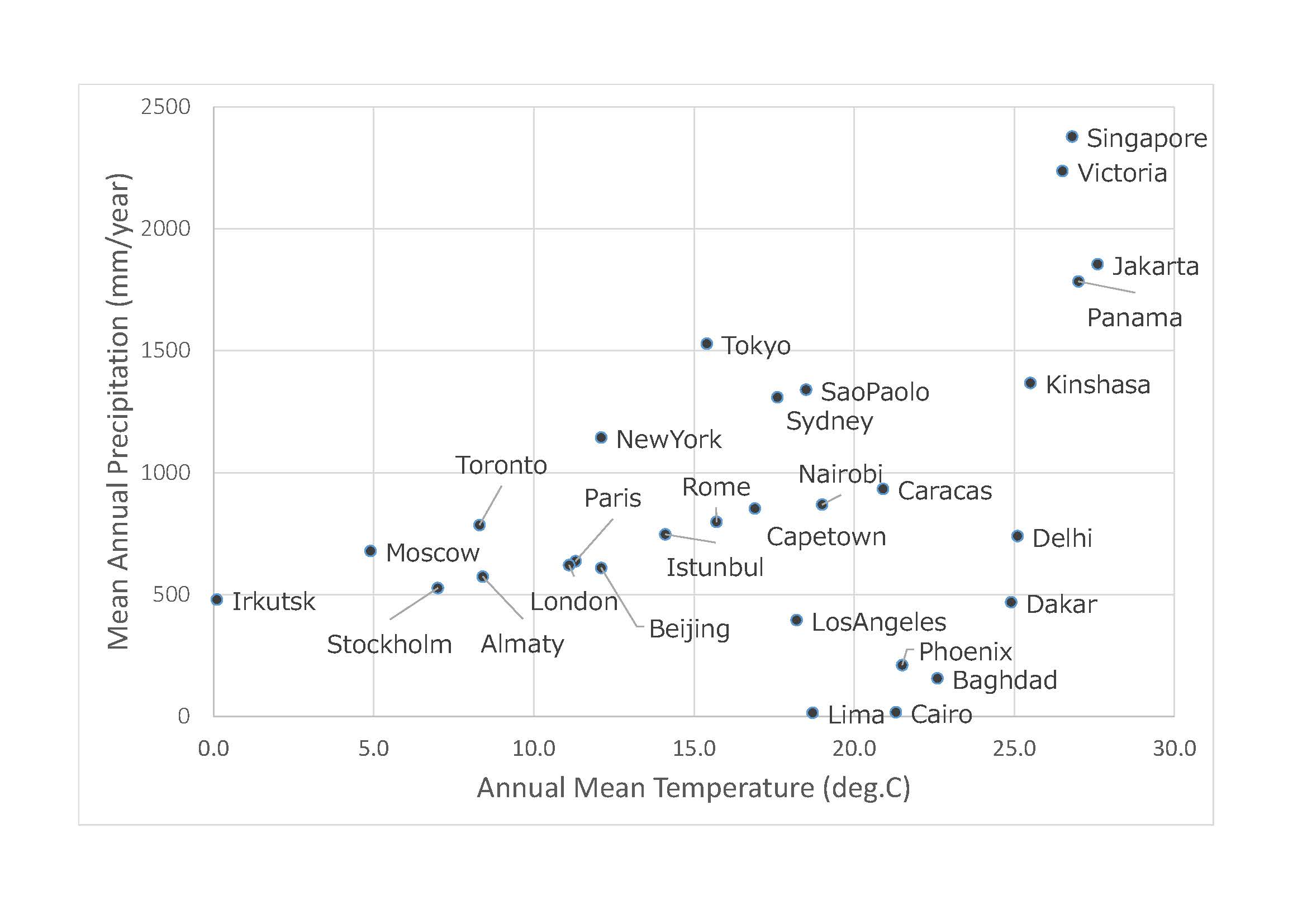 Figure 1: Annual mean temperature (℃) and mean annual precipitation (mm/year) in arbitrarily selected major cities in the world.