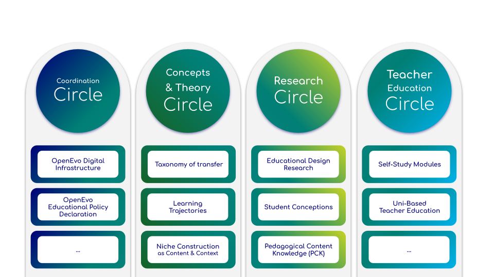 The OpenEvo network structure is inspired by the sociocratic model of governance, and the network has begun to identify and organize around four global Organizing Circles. This minimal structure aims to enable teacher educators and education researchers to also form regional or special-interest sub-circles, thus supporting locally relevant projects and effective collaboration.
