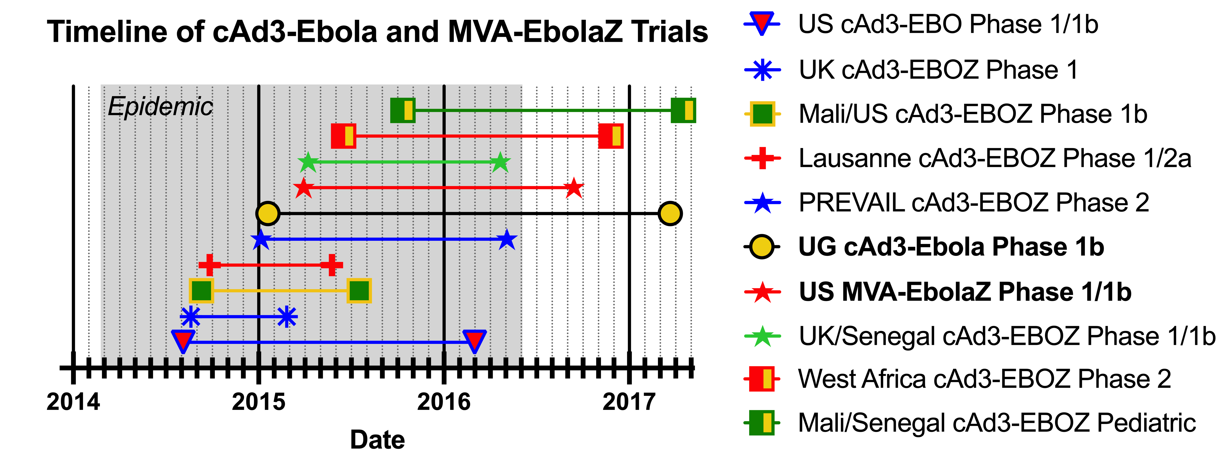 Coincident with the start of the PREVAIL trial (Figure 1), a phase 1b clinical trial of the cAd3-Ebola vaccines began in Uganda (UG). In the UG phase 1b clinical trial, both cAd3-EBO and cAd3-EBOZ were assessed. As described in our current report, along with 69 naïve participants, the UG trial recruited 21 participants with prior DNA Ebola vaccine exposure. Compared to naïve recipients, antibody titers peaked earlier after cAd3-EBO administration and were sustained at a higher titer in those with prior Ebola vaccine exposure. These results demonstrated that the DNA Ebola vaccines (Kibuuka et al., 2015; Sarwar et al., 2015) prime the immune system for a rapid recall to cAd3-EBO, and that cAd3-EBO is safe in both naïve and antigen-exposed individuals.