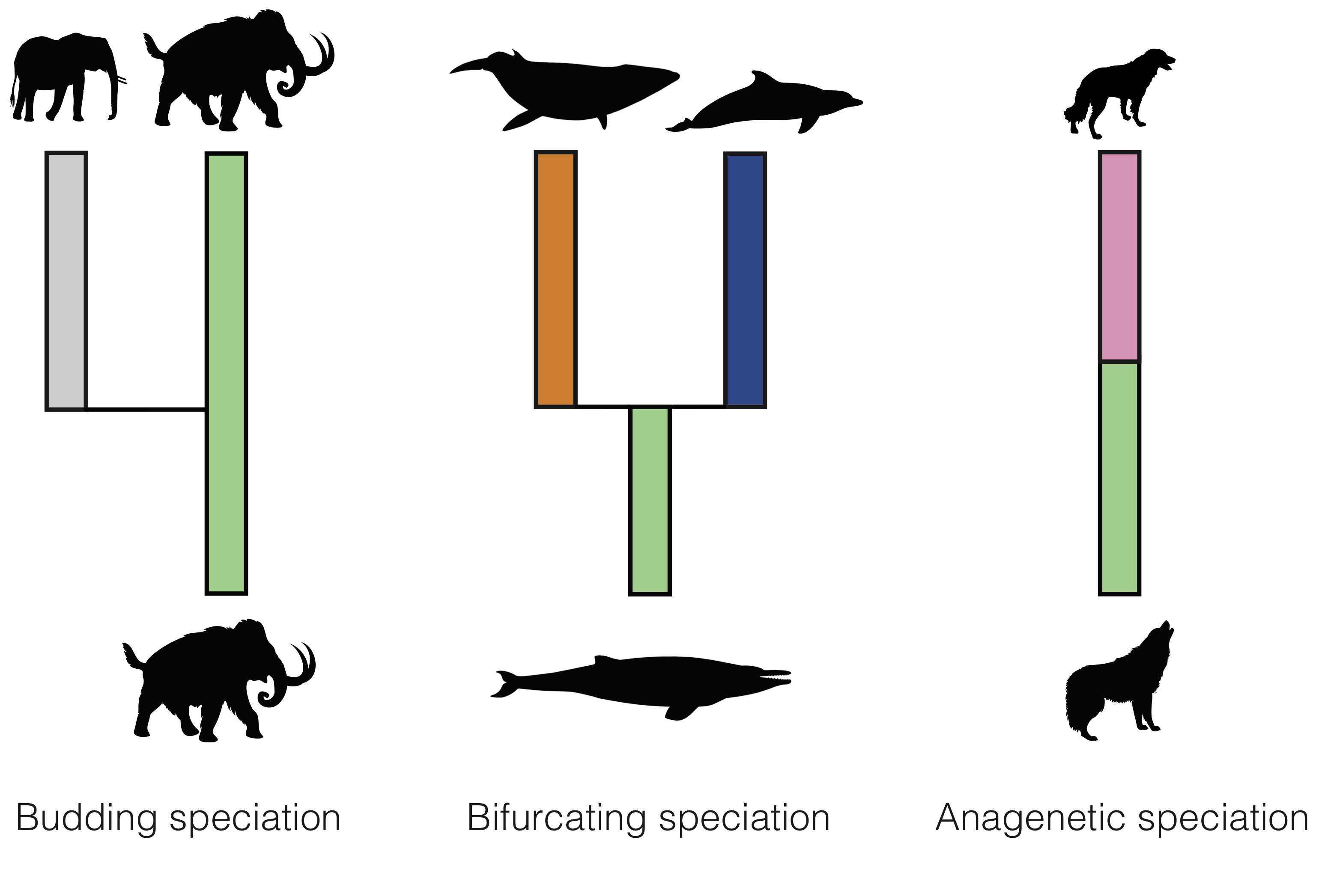 On the other hand, in phylogenies, we simply track the branching events, which essentially only allows to quantify the pace of branching speciation, without explicitly modelling extinction of the ancestral species. Thus, bifurcating speciation and budding speciation appear as branching speciation in the phylogeny, only extinction without replacement is explicitly modelled, and anagenetic speciation is not modelled in the phylogeny at all.