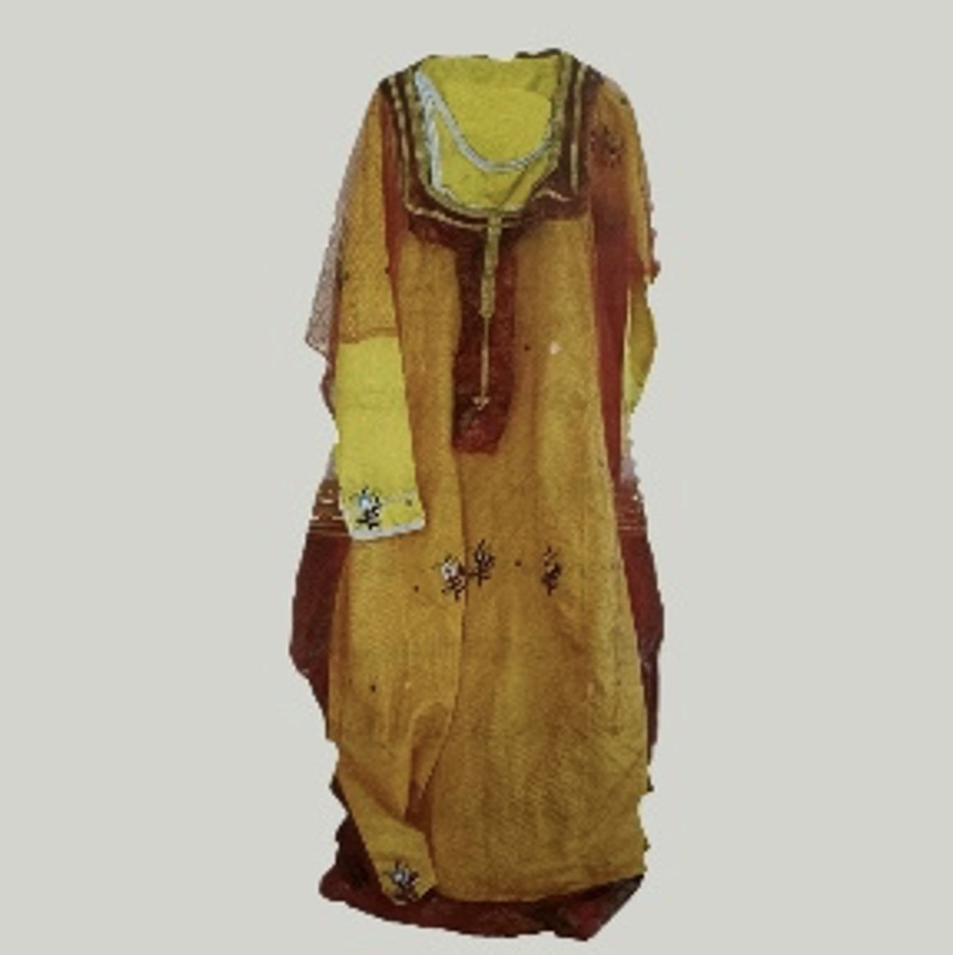 For example, the image of the kandoora is paired with a bright yellow prism fabric known as Bu taira (flowers with leaves like bird wings), while the fabric for the dress is a light material called Dama't Fareed in red colour. The decoration was fixed on the dress at the neck opening with a fabric stabilizer beneath it due to the lightness of the dress fabric.