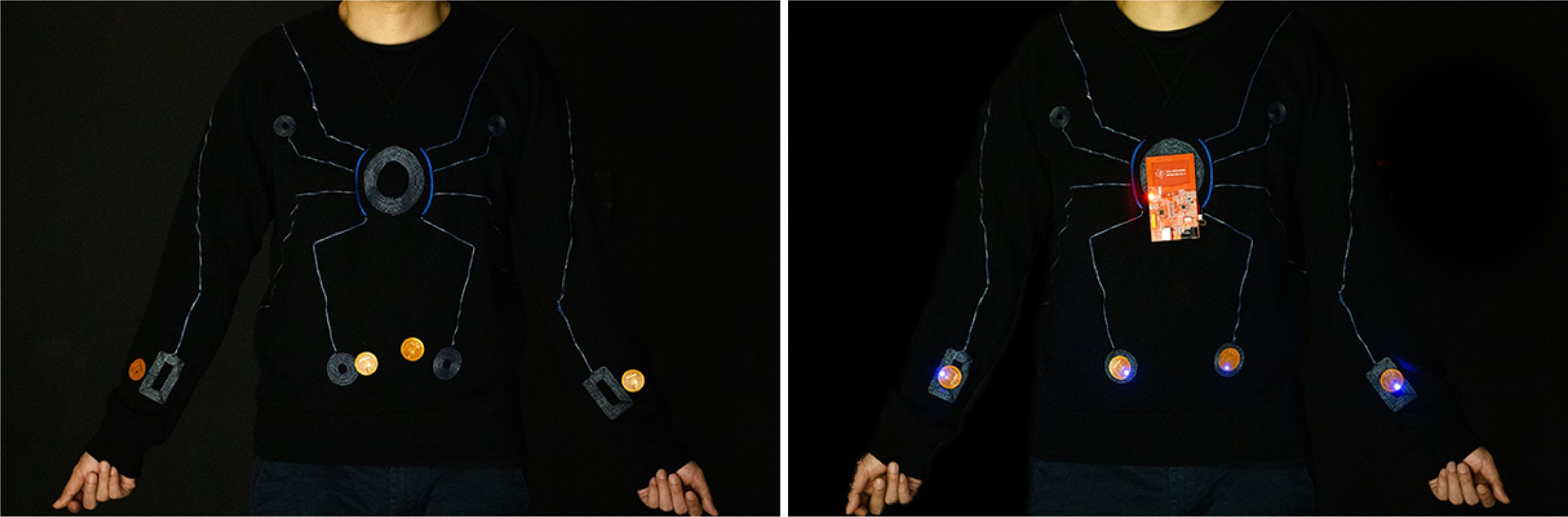 Figure 2. Photograph of wireless powering through the near-field-enabled clothing.Looking back, I find it surprising how a physical law elucidated nearly 200 years ago could be applied to address a critical challenge in modern wearable technologies. To me, this is a reminder of how we need to stand on the shoulders of giants make progress. Although much work is still needed to clinically validate our prototype for diagnostic or therapeutic use, we think that the conceptually simplicity and robustness of the near-field-enabled clothing make it particularly useful in real life. We envision that such clothing will facilitate the connection of skin-like devices into sensor networks for healthcare, athletic, and military applications.