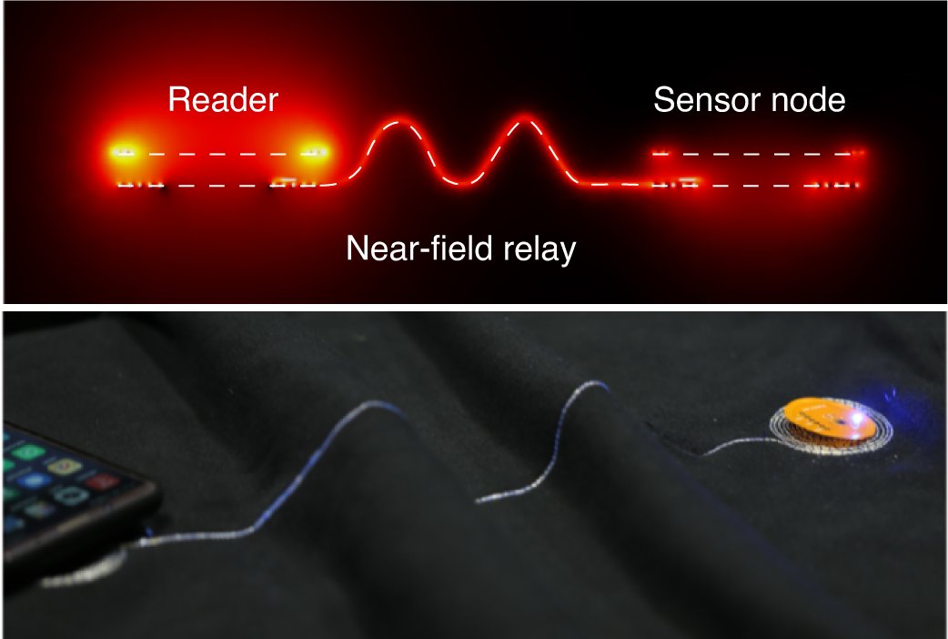 Creating such a network requires a wireless technology to connect many sensors to a single hub device, like a smartphone. Ideally, the technology could not only enable the hub to communicate with the sensors, but also wirelessly power them so that the sensors do not need batteries, which need to be regularly replaced. Such a technology exists today in the form of near-field communication (NFC), which is widely used in smartcard and mobile payment systems. The limitation, however, is that the sensor must be “near” – at most a few centimeters from the smartphone. This range is not enough to construct a sensor network that covers a major portion of the body.