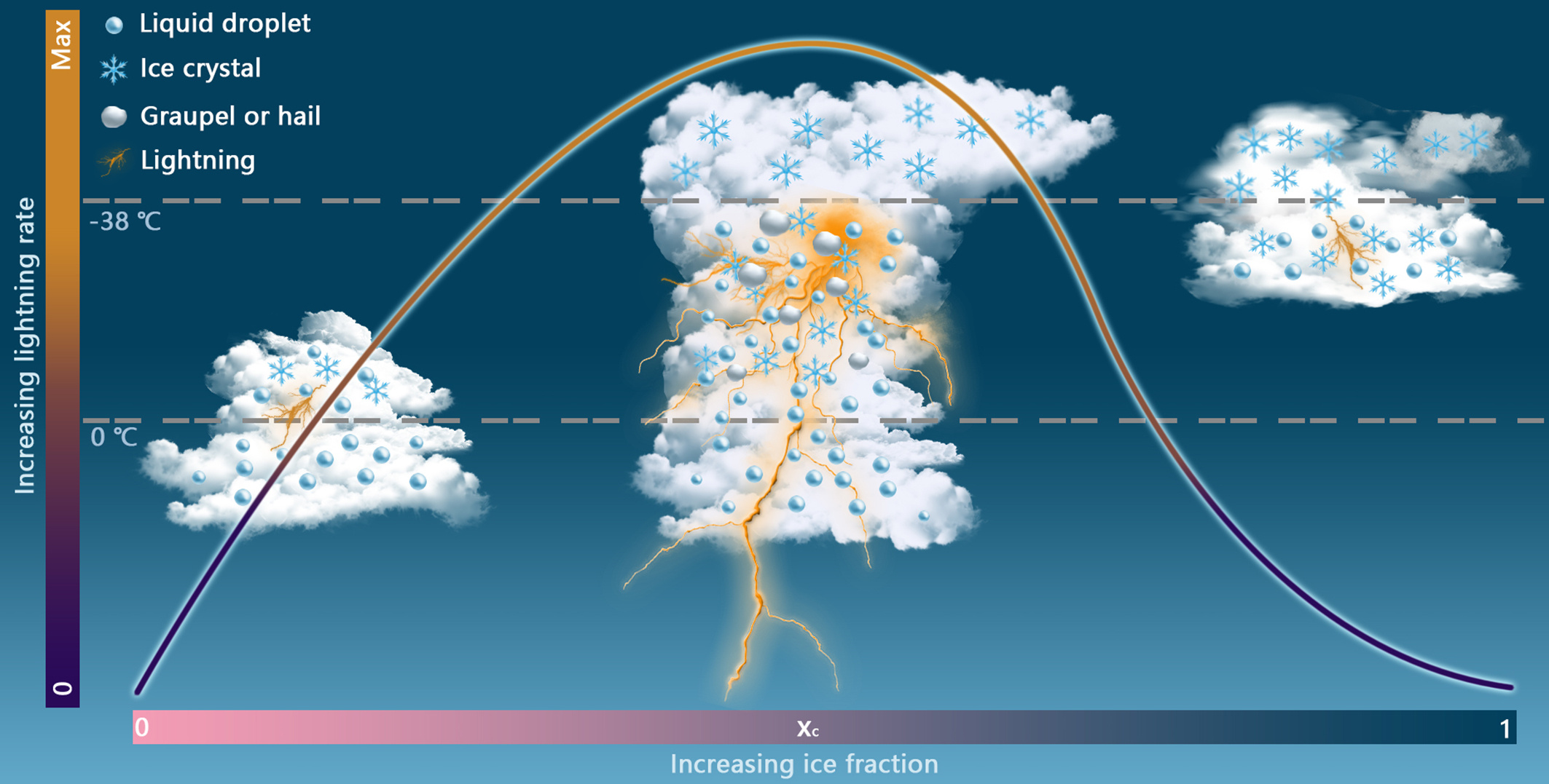 Our results show that the response curve of the lightning rate to cloud ice fraction firstly increases and then decreases. By conducting the theoretical analysis with the data of LWP, IWP, convective available potential energy (CAPE), the content of total column water vapor (TCWV), and cloud type, a schematic diagram regarding the effects of cloud ice fraction on lightning activities is demonstrated in Fig. 2. Specifically, lightning rate increases initially with increasing cloud ice fraction in shallow and warm clouds (e.g. stratocumulus); maximum flash rates are reached at a critical cloud ice fraction value that is associated with deep convective clouds, whose cloud hydrometeors provide the areas where the NIC occurs efficiently through collisions between them, then produce the most lightning activities; beyond the critical value, lightning rate decreases as the ice fraction increases to values representative of ice clouds (e.g. cirrus, cirrostratus and cirrocumulus).