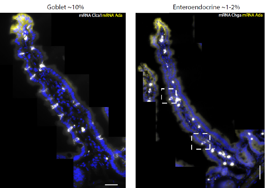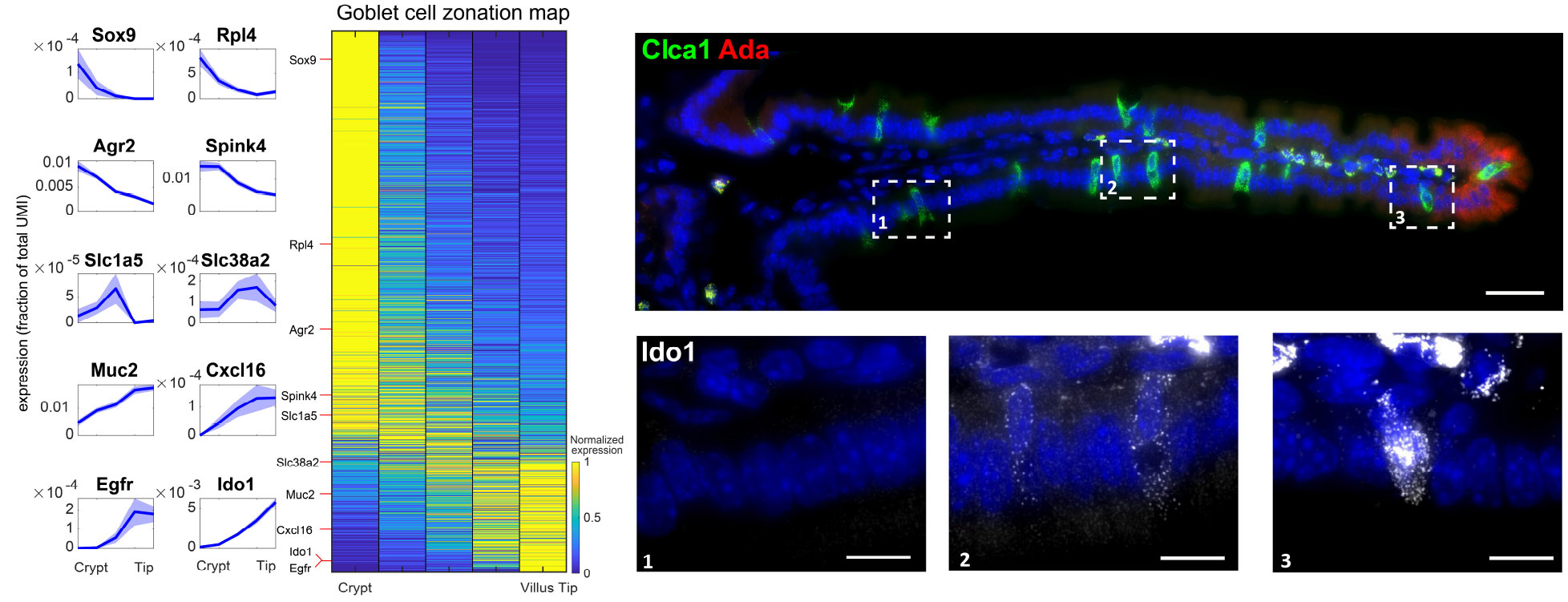 Spatial diversity of intestinal secretory cells. By using ClumpSeq in the gut we identified several surprising patterns. We found that goblet cells, the cells that secrete protective mucus, showed distinct functions at the villus tip. Cells in this zone operate in close contact to a large community of microbes, which can elicit an aggressive inflammatory response by immune cells. ClumpSeq showed that the goblet cells at the villus tip express anti-inflammatory molecules that inhibit this response, such as the immune checkpoint gene Ido1 (Figure 4). We also found that the chemosensory tuft cells have distinct functions in different villi zones, expressing neuronal-like genes at the villus bottom and immune genes at the villus tip. Finally, we identified surprising spatial patterns of the hormone-secreting enteroendocrine cells. We found that some of these sub-types of cells are not equally spread along the villus axis. For example, the cells that secrete the hormone somatostatin are confined to the crypt or the bottom of the villus.
