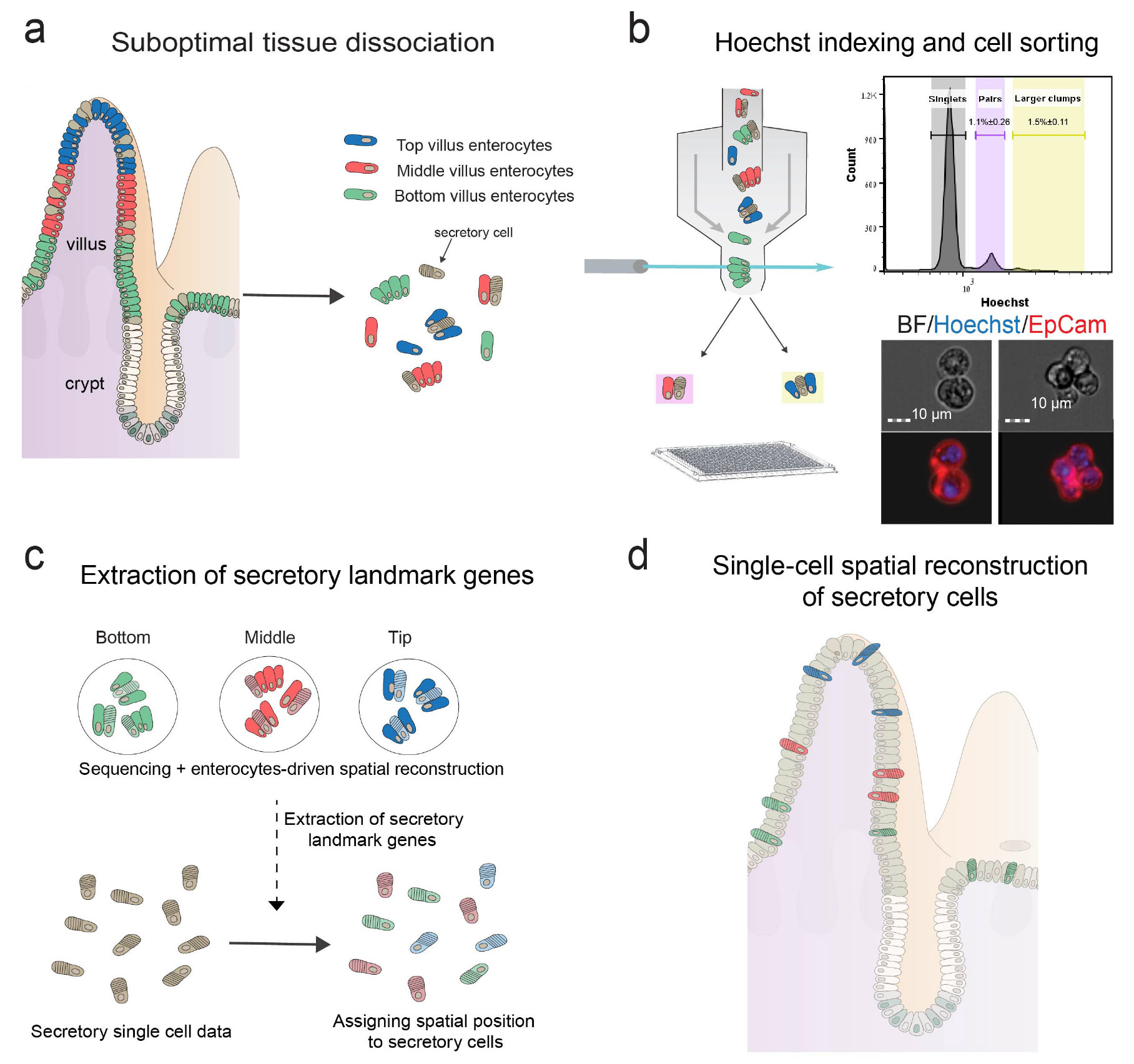 But the intestine, as do other epithelial tissues, also contains several additional rare, yet critically important cell types, for which resolving zonated expression patterns is much more difficult (Figure 2). In the intestine, these rare cells include secretory cells that either produce protective mucus, secrete hormones or mediate immune responses. Since these cell types often comprise less than 1% of the tissue cells, their transcripts are diluted out in spatial measurement techniques. The challenge of identifying zonation patterns for these rare cells motivated us to develop a new technique for sequencing the transcriptomes of small clumps, which we termed ‘ClumpSeq’.