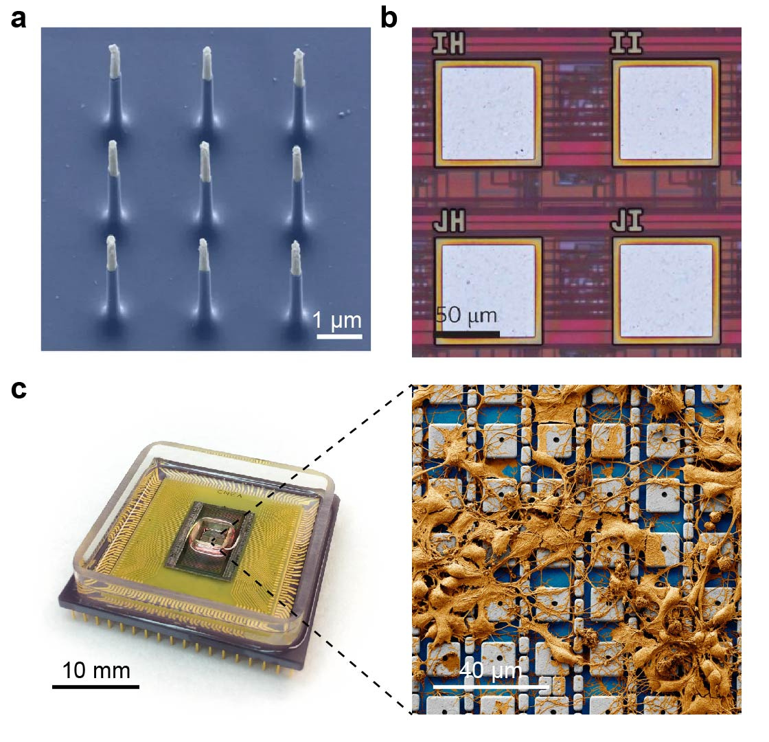 Fig. 1 | Research progression of the CMOS nanoelectrode array technology. a, The vertical nanoelectrode array demonstrated intracellular access to neurons using top-down fabricated, nanoneedles. Off chip electronics were used to record from a 4×4=16 nanoelectrode array. Copyright 2012 Springer Nature. b, The vertical nanowires were combined with CMOS technology to parallelize the system to 32×32=1,024 nanoelectrodes. Intracellular access was only accomplished with cardiac cells: the permeabilization of neuron membranes was too strong and resulted in cell death. Copyright 2017 Springer Nature. c, A new CMOS nanoelectrode array (left) improved the nano-bio interface and permeabilization process to enable intracellular recording from rat neurons (right). Various nanoelectrode geometries were demonstrated to attain the intracellular access using platinum black. The device contains a 64×64=4,096 nanoelectrode array and records intracellular signals from more than 1,700 rat neurons. Copyright 2019 Springer Nature.
