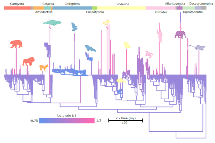 Figure 2: Phylogenetic tree of mammals with branches scaled to show evolutionary rates of change in relative brain mass. Some of the biggest rates can be seen in some very charismatic taxa, including humans, lions, and elephants.