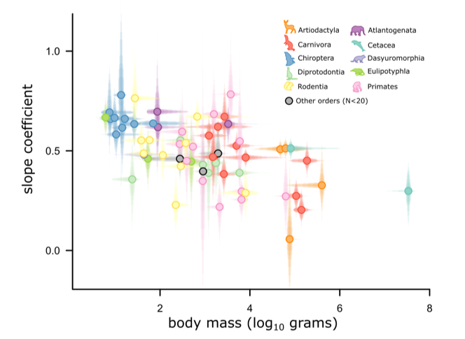 Figure 1: Using linear models to estimate the relationship between brain and body mass across mammalian families reveals a size-dependency, implying that these models fail to properly account for the effects of body mass.