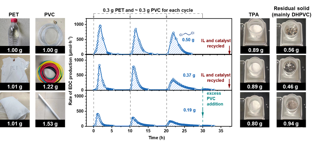 Ionic liquids (ILs) may serve as a suitable medium for this purpose (Figure 2a), as they exhibit low vapor pressures, high thermal stabilities, wide liquid ranges, and reversible gas absorption abilities5,6.It has been reported that IL could be used for PVC dehydrochlorination7,8. Our experiment also verified that PVC can effectively dehydrochlorinate in ionic liquids, and the released HCl can be effectively stored in ionic liquids. The stored HCl can be used for the conversion of PET polyester to produce DCM and TPA effectively. This system is also appliable for real-life plastic products made by PET and PVC. The ionic liquid and catalyst can be recycled for sustained reuse.