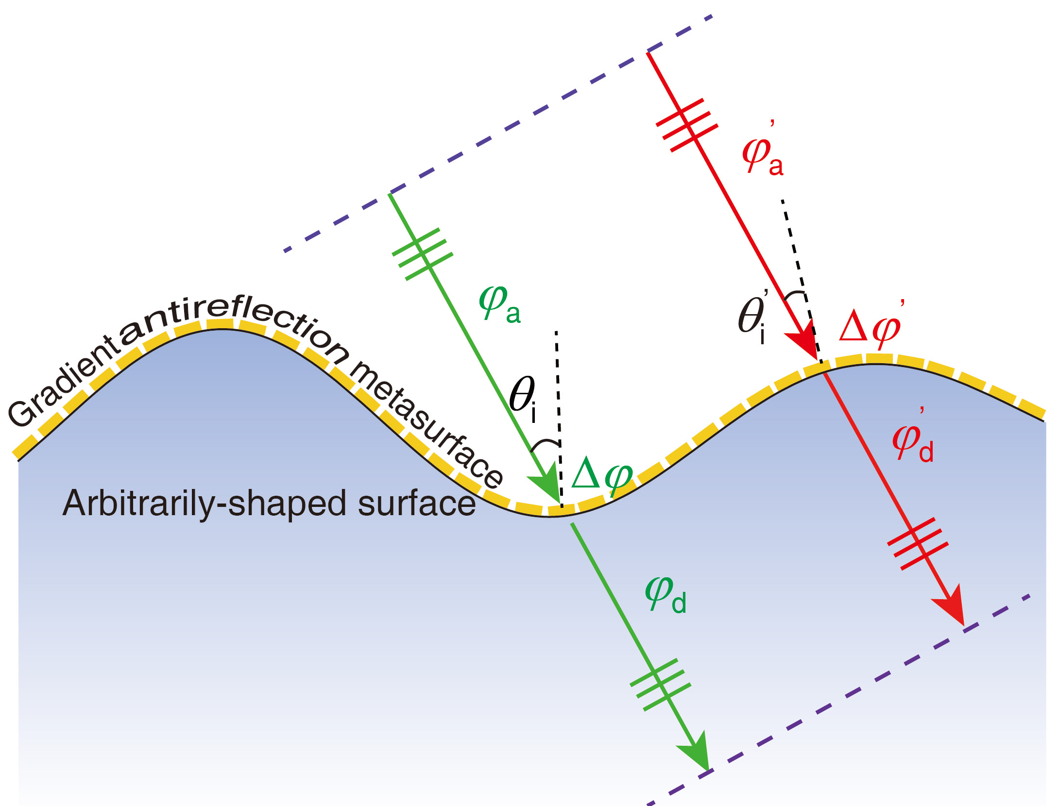 In this work, we propose that multi-layer gradient antireflection metasurfaces (GAMs) can break the above limitation of phase locking and therefore merge the functions of anti-reflection and wavefront manipulation. We not only theoretically and experimentally demonstrated the first realization of the removal of both reflection and refraction on a dielectric surface, i.e. an obliquely incident beam transmitting straight through as if the surface doesn’t exist. We further extend this scheme to general curved surfaces and relatively high-index dielectric (ε=12), as schematically shown in Fig. 2. The coalescence of anti-reflection and wavefront controllability shows a great potential to improve the efficiency and increase the ways of coupling between materials with substantial contrast. With such techniques, wave steering metasurfaces can be applied to the surfaces of many materials, where the reflection caused by impedance mismatch of the material can be eliminated, guaranteeing an unprecedented high efficiency. Besides the “invisible surface”, many other functionalities such as reflection-less negative refraction and reflection-less flat axicon can also be realized by utilizing this concept of GAMs.