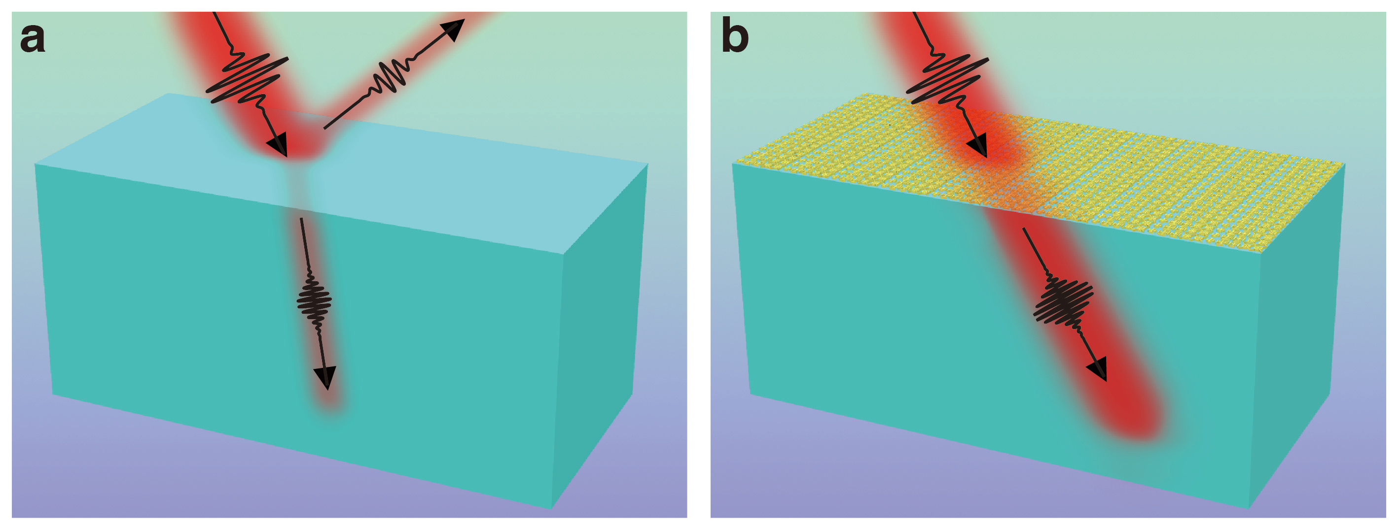 Fig.1 a. The reflection and refraction on a dielectric surface. b. The concept of applying GAMs to make the surface “invisible”.