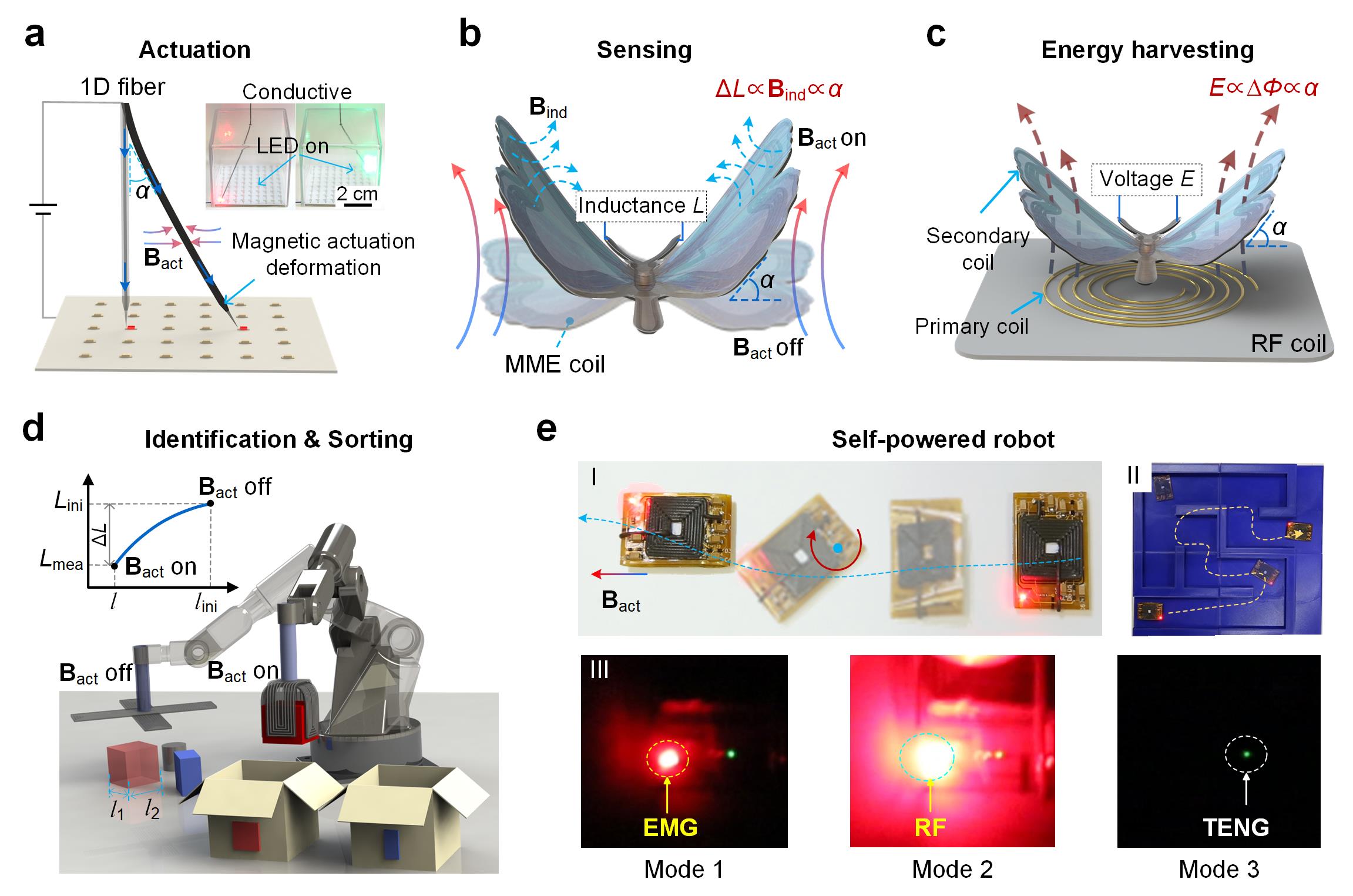 Fig.2 Magnetic driven deformation, sensing, and energy harvesting of the MME structures. (a) A 1D MME fiber with hybrid magnetic actuation and conduction functions. (b) Schematic diagram of the deformation sensing of a 2D butterfly robot with the MME coil skeleton. α is the deformation angle; L is the inductance of the integrated MME coil; Bind is the inductance magnetic field of the integrated MME coil. (c) Wireless energy transfer for a 2D butterfly robot with the MME coil skeleton. (d) Demonstration of a soft manipulation application of a 2D MME gripper. The robot-assisted MME gripper for object identification/sorting. (e) Self-powered application demonstration of a soft MME robot. Actuated by a rotating magnetic field and a gradient magnetic field, the soft MME robot performs rotational and translational motions (Ⅰ) and passes through the maze (Ⅱ). (Ⅲ) Along with the motion/deformation, the soft MME robot can generate energy in three modes (Mode 1: low-frequency electromagnetic power generation to light up the red LED; Mode 2: high-frequency electromagnetic power generation to light up the red LED; Mode 3: triboelectric power generation to light up the green LED).