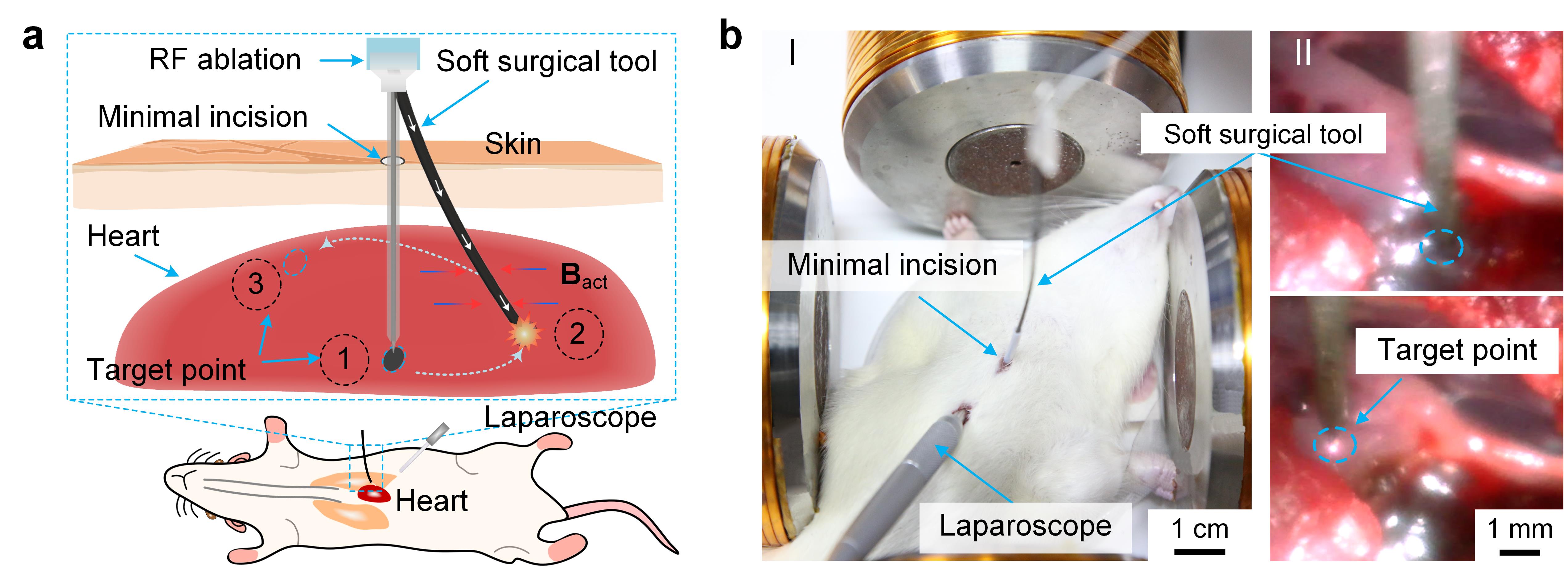 To show how the co-axial fiber can be used in a biomedical context, we create a catheter-style soft surgical tool for minimally invasive electro-ablation surgery in vivo on a rat heart (Fig. 3). Controlled by an actuation magnetic field, the flexible MME fiber catheter can be manipulated in an enclosed space for precise and minimally invasive surgery on rats. Compared with the operation by a rigid interventional device, the catheter-style soft surgical tool offers the flexibility of accessing a large operation area in a confined space through a small entrance hole, presenting a promising strategy for targeted and minimally invasive surgery.