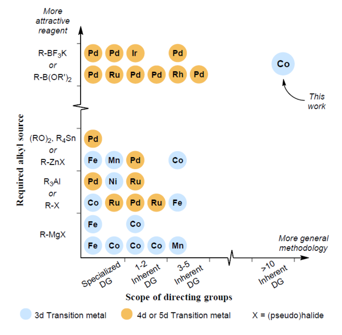 Herein, we present a cobalt-catalyzed C–H methylation reaction, that take advantage of functional groups which are inherently present in modern drug molecules, to allow selective and predictable late stage functionalization. The lack of literature precedence and complexity of the transformation necessitated the used of carefully planned high throughput experimentation during the reaction optimization, in fact we did more than 2000 reactions to find a window of reactivity that enabled efficient and robust product formation. Additionally, the HTE-endeavor set the stage for an unprecedented versatility of inherent directing groups in combination with chemically benign reagents, namely a boron-based reagent and a environmentally-benign cobalt precatalyst. We hence learned, in focused studies, what functional groups would prevail in substrates containing multiple coordinating motifs, making this reaction very predictable in terms of regiochemical outcome.