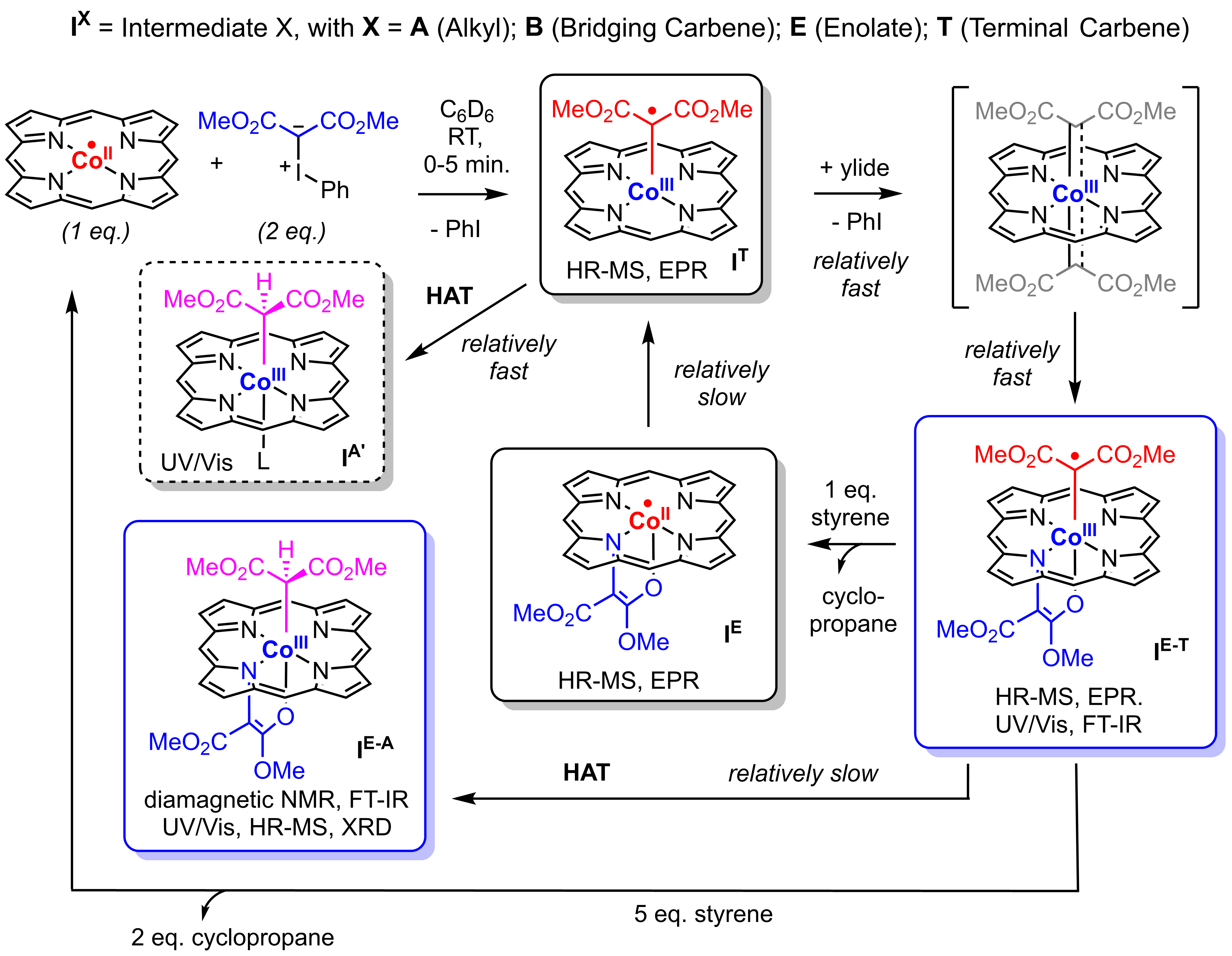 Both “mono-carbenoid” (cobalt(III) mono-carbene radical IT) and “bis-carbenoid” (cobalt(III) N-enolate carbene radical IE-T) species are detected under the catalytic reaction conditions. Epping et al. have shown that catalytic transfer of both “carbenoid” moieties of IE-T to C=C bonds is possible, which proceeds via a complex catalytic mechanism involving two interconnected cycles. The reactive paramagnetic cobalt(III) mono-carbene radical (IT) and cobalt(III) N‑enolate, carbene radical (IE-T) intermediates involved in these reactions are characterized using a combination of several spectroscopic/spectrometric techniques, experimental design, computational modelling and trapping experiments, including X‑ray diffraction of a HAT deactivated N-enolate complex. Remarkably, the “mono-carbenoid” species IT do not form stable N‑enolate isomers, while the “bis-carbenoid” species are most stable as cobalt(III) N-enolate carbene radical species IE-T, and as a result N‑enolate formation is reversible. Since the “bis-carbenoid” cobalt(III) N-enolate carbene radical complex IE-T has a reduced tendency to undergo catalyst deactivation via HAT when compared to the “mono-carbenoid” species IT, the observed “over-carbenation” by iodonium ylides is actually beneficial for catalysis. The interplay of opposing stabilities between terminal and N‑bridging carbene radical moieties dictated by the CoII/CoIII-redox cycle thus plays an important role, and explains the unique active participation of the otherwise catalytically inactive N-enolate species. Future application of these unique species holds the potential to unlock new scaffolds via the superior activation of acceptor-acceptor iodonium ylides over diazo compounds.