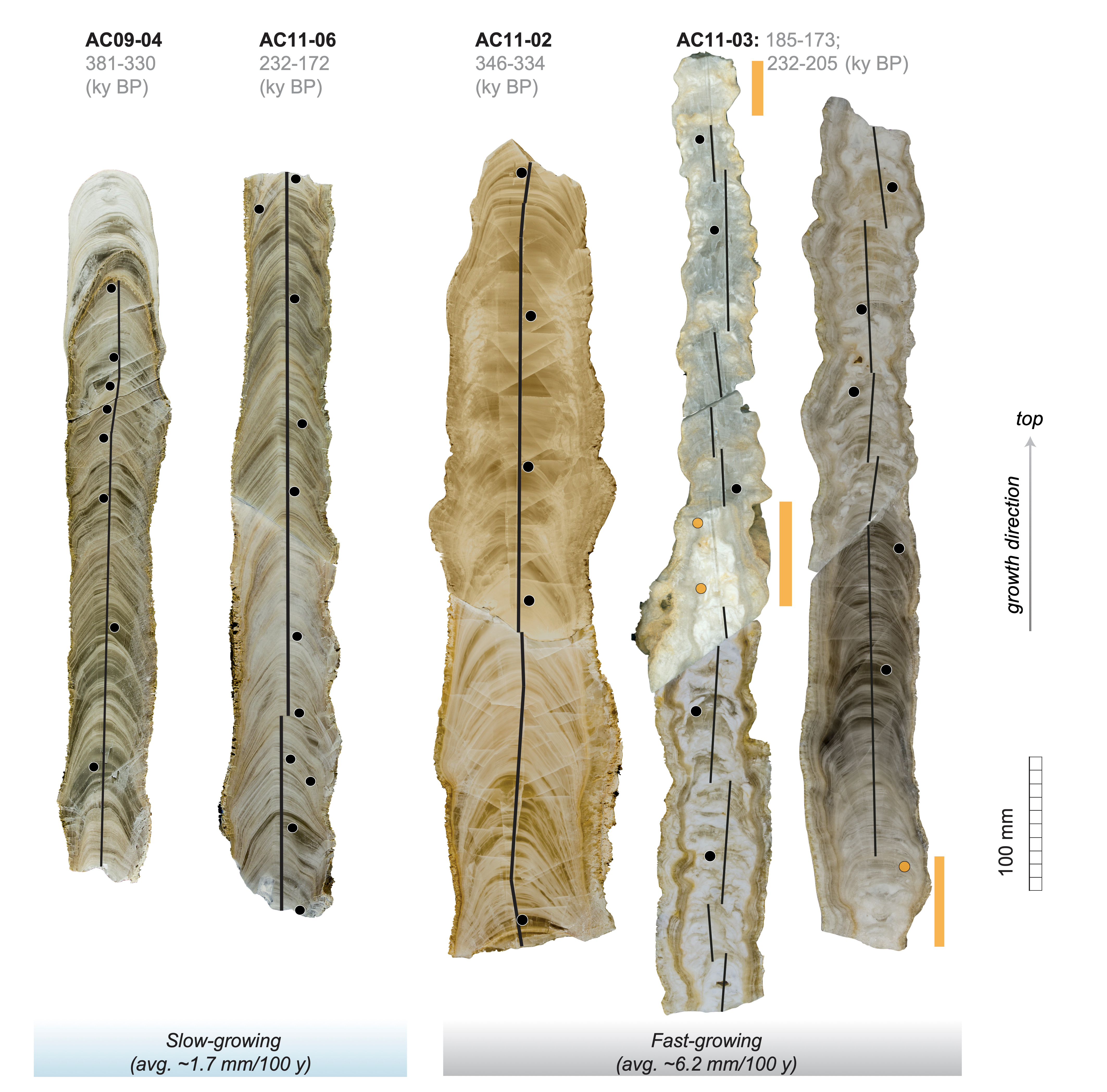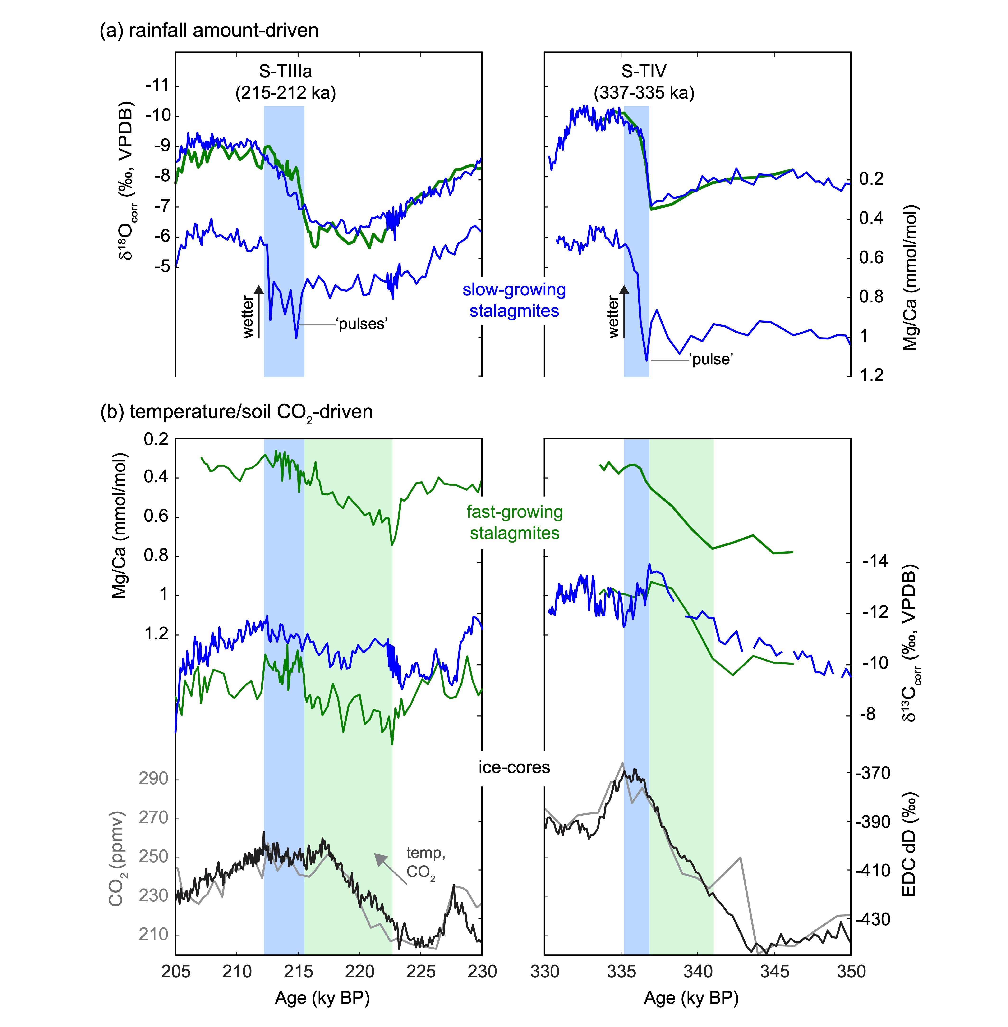 The pairs each span a glacial termination: TIV (342–332 ky BP) and TIIIa (220–210 ky BP). Each glacial-interglacial transition is recorded by one fast-growing stalagmite (~6 mm per 100 years) and one slow-growing stalagmite (~2 mm per 100 years).