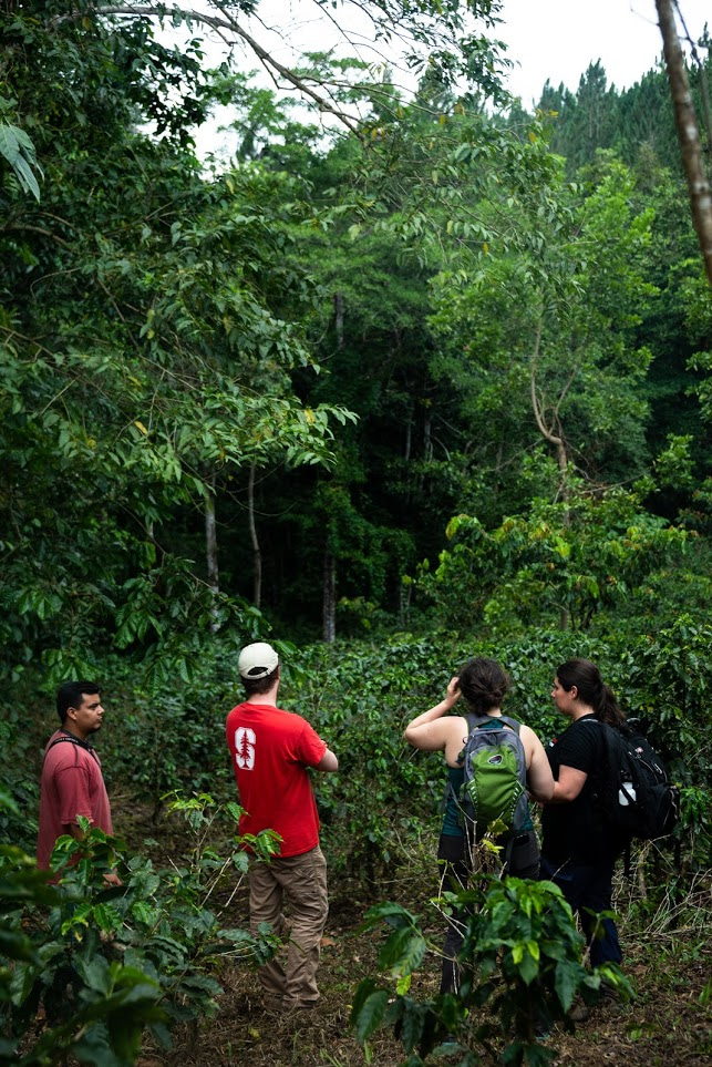 Costa Rican collaborator Esteban Calderon Porras with Stanford graduate students Jeffrey Smith, Caroline Dawes, and Kelley Langhans in a diversified coffee farm in Coto Brus, Costa Rica (Photo credit: Suzanne Ou)