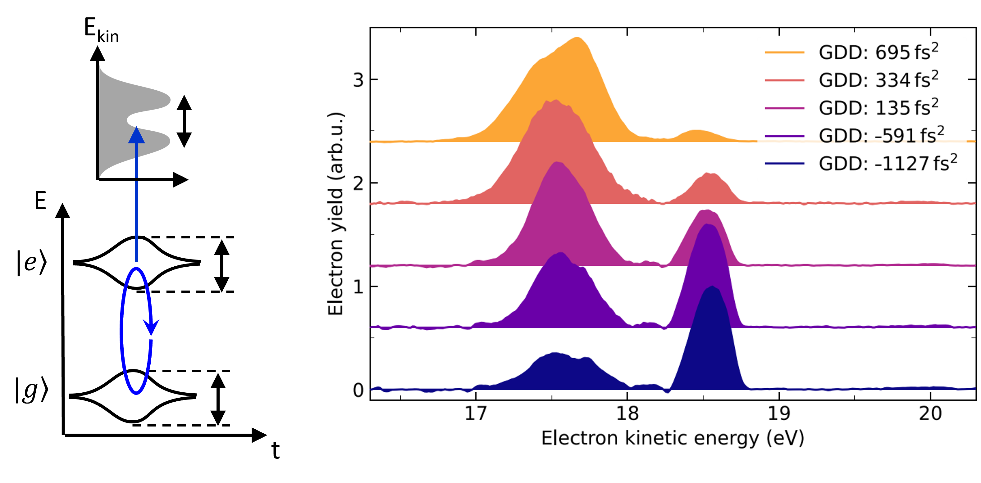 In this study, a key step towards this development is achieved: the control of quantum dynamics by the shaping of XUV pulses is established. The concept is applied to a fundamental problem, that is the control of the quantum dynamics in a strongly driven few-electron system. To this end, helium atoms are irradiated with highly intense XUV pulses produced by the free electron laser FERMI, a large-scale facility in Trieste, Italy. If an atom (or any other quantum system) is exposed to intense fields, the energy levels of the electrons start to shift or even split up into multiple states. Under these conditions, the quantum dynamics of the system have to be described by coupled electron-photon states, so called “dressed states”. In the experiment, these hybrid states exist only in an ultrashort time window during the perturbation of the system by the light pulse. The ultrafast dynamics of these short-lived states are successfully controlled by shaping the phase of the XUV laser pulses (see figure). These results are a fundamental demonstration that quantum control using shaped laser fields can be indeed extended to the short-wavelength domain. This opens an exciting route towards the exploration and control of matter with unprecedented capabilities.