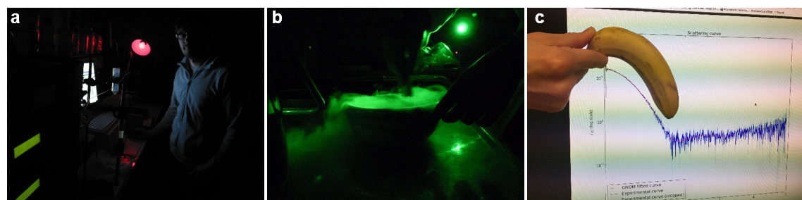 Figure 1: Working in the dark with photoenzymes is fun. a, Marco in the dark room purifying protein. b, Judith extracting the Pchlide substrate from de-etiolated wheat seedling (we later on had to switch to a different Pchlide source, because of mouldy problems. c, Andreas recording TeLPOR SAXS data at BM29 in Grenoble, holding the first 3-dimensional model that he “generated” in his hand.