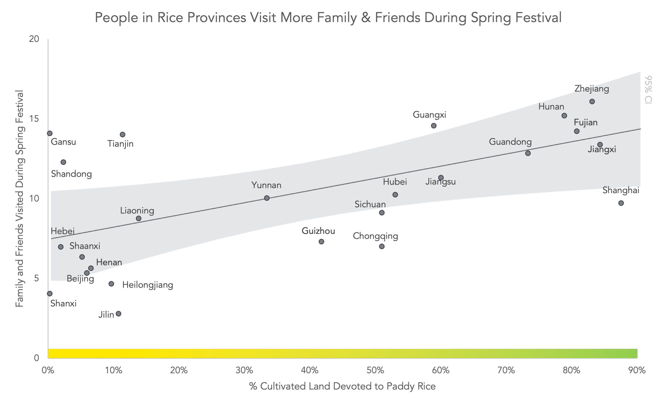 My collaborators and I thought culture might play a role in how people balance the social pressure of the holiday. To disentangle the role of culture, we leveraged that fact that southern China and northern China have different cultures. Southern China has a history of rice farming, which required more labor than the wheat farming of the north.