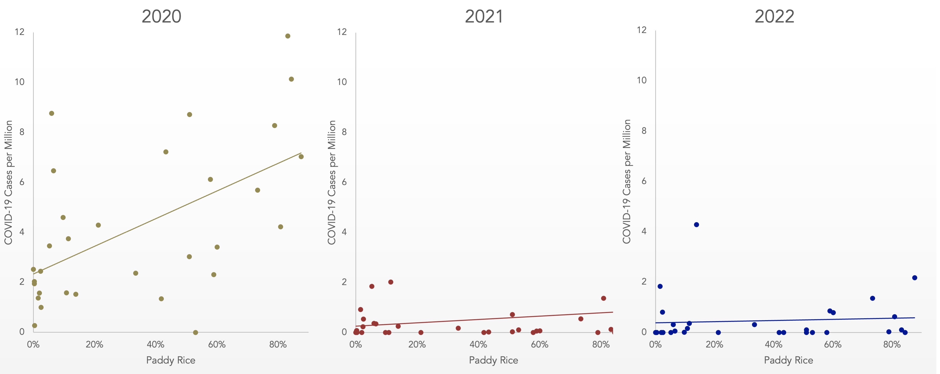 When we analyzed Chinese New Year infections in 2021 and 2022, we found no relationship with rice. By this point, the norms for caution and social distancing were clear enough to outweigh the norms for holiday visits.