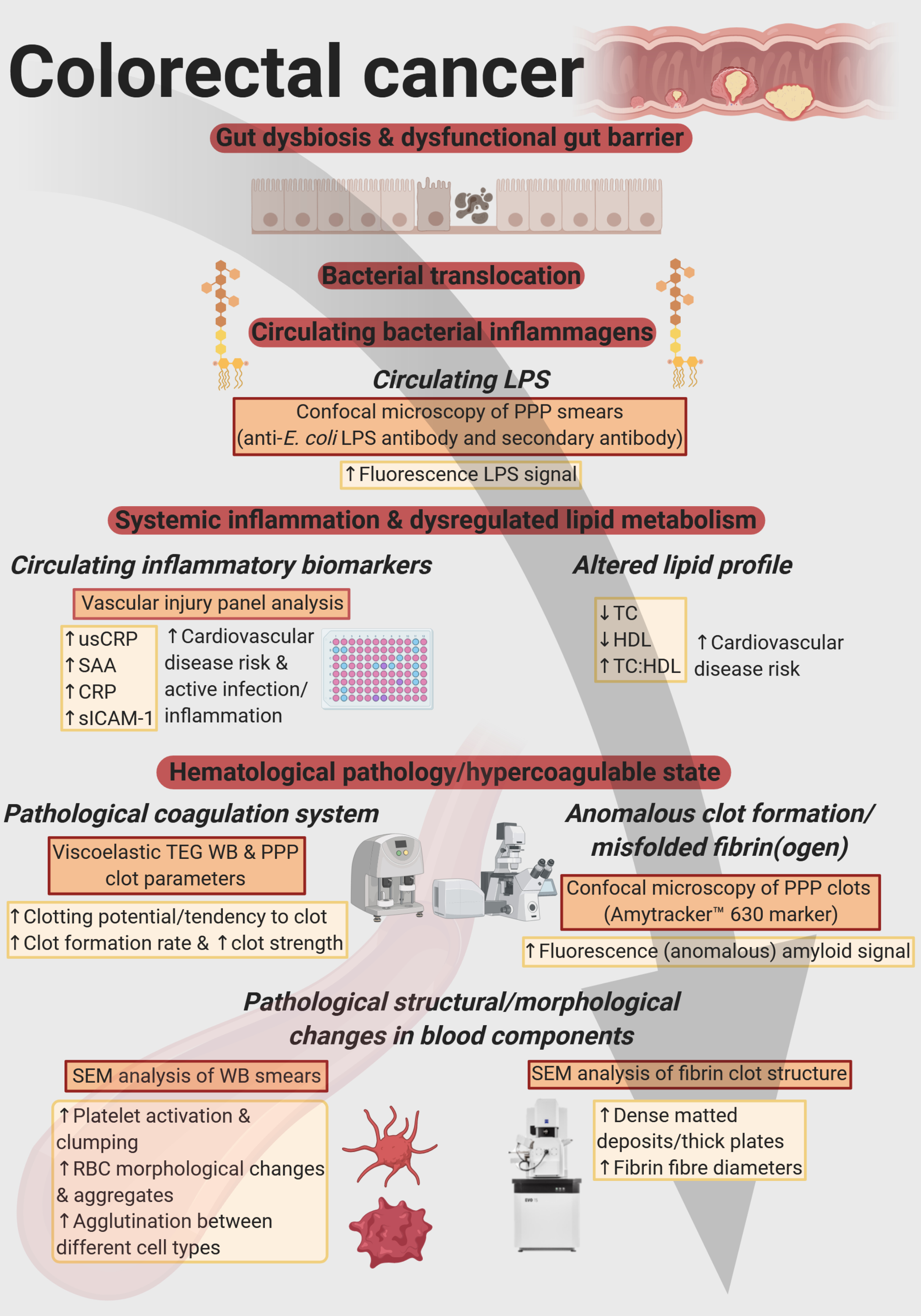 One of us, Willem de Villiers, is a gastroenterologist and an expert in Inflammatory Bowel Disease. He has often noticed in the clinical setting that patients who experience flares of their chronic intestinal inflammation or who suffer from CRC also are more likely to have complications such as venous thrombosis (hypercoagulability). This paper investigated the presence of circulating lipopolysaccharide (LPS) and other circulating biomarkers, indicative of systemic inflammation and abnormal clot formation, in healthy individuals and patients with newly diagnosed CRC.