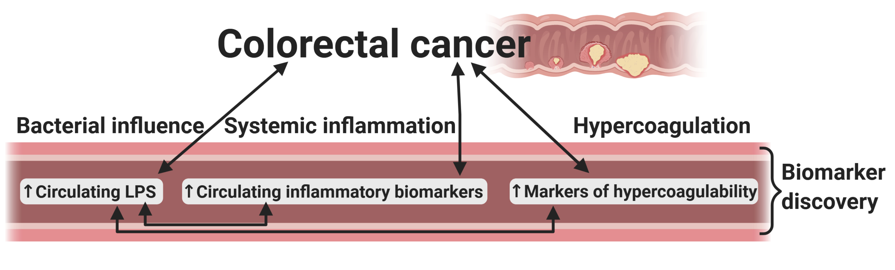 We showed that circulating levels of LPS are significantly elevated in the CRC population. Moreover, markers of inflammation and hypercoagulability are also increased in this population. Statistical regression models identified markers with strong association with CRC, and we investigated the correlation between these markers. A core aim of our study was therefore biomarker discovery for CRC across a wide range of groups (see Figure 1).