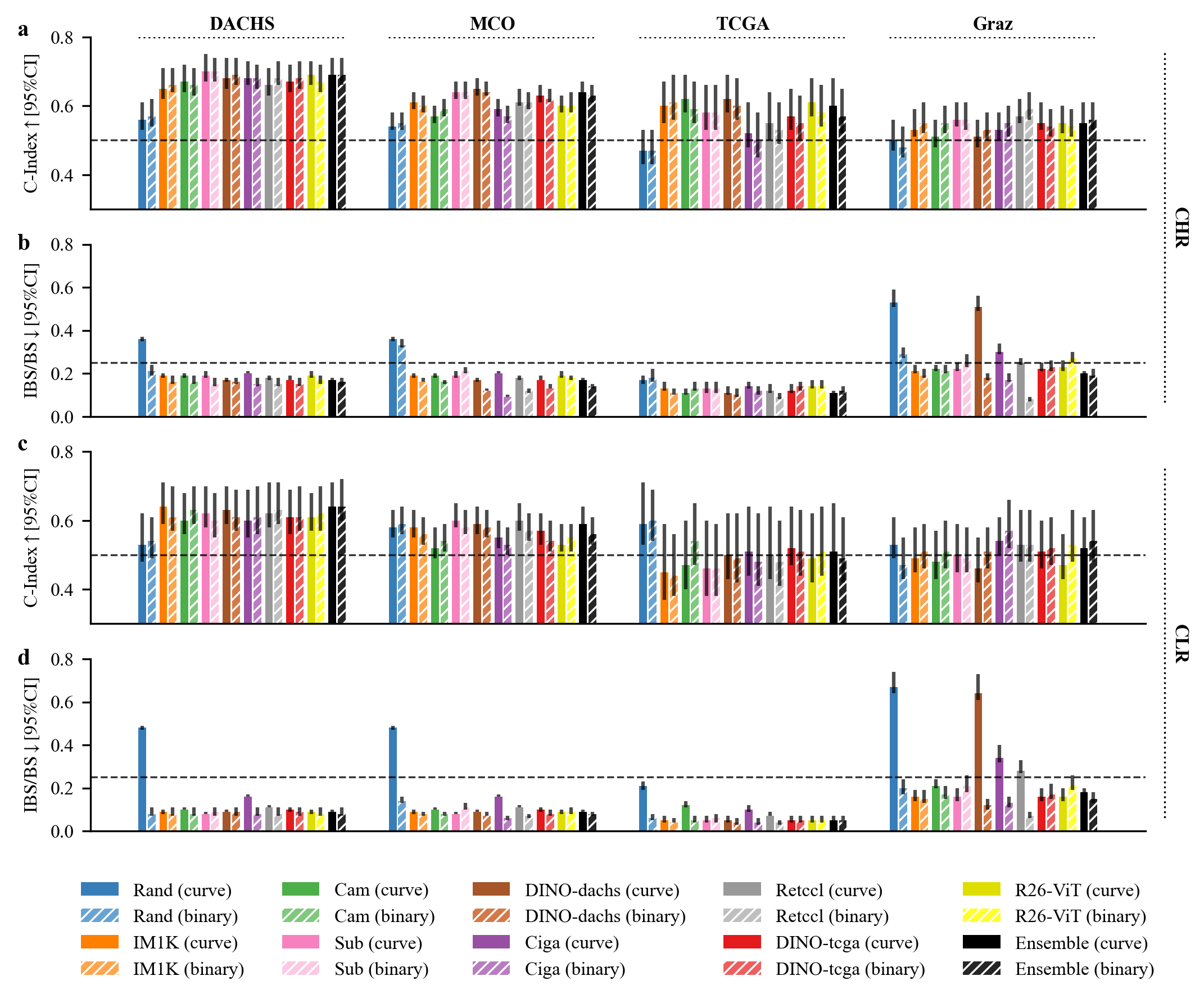 Both the survival curve approach and the binary approach exhibited limited generalization. Especially regarding the feature extractor, we think that this is a valuable finding. We included feature extractors that were similarly used in previous studies as well as models trained on large amounts of histological data in a self-supervised manner, usually considered to have good generalization capabilities even though or especially because they are not fine-tuned. They did not generalize significantly better than for instance a ResNet18 pre-trained on ImageNet. We also observed that many models performed worse on specific cohorts even if they worked very well for others. The performance strongly depends on the individual cohort. Largely independent of the input tissue, feature extractor or survival network we employ, the models generally performed good on two, and worse on the other two cohorts, pointing to systematic differences between the cohorts.