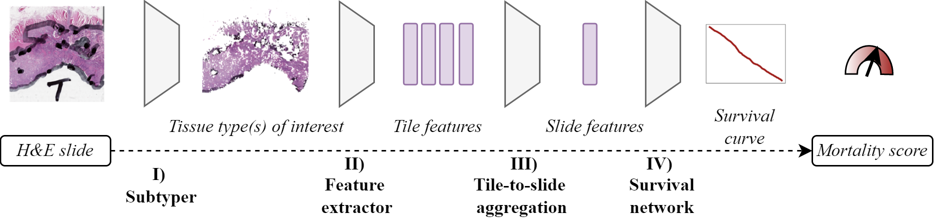 Our study leveraged four cohorts, enabling comprehensive testing of our approach. We employed a modular pipeline building on those constructed in studies so far. This allowed us an in-depth analysis of the impact of variations within the pipeline including input tissue (e.g. tumor vs non-tumorous tissue) and feature extractors. We compared our strategy directly with the binary approach that predicts a single risk score.
