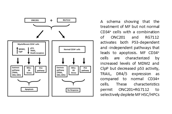 In the most recent manuscript in Leukemia, Dr. Hoffman’s group reports the outcomes of in vitro studies of CD34+ HSPC from 21 different MF patients which indicate that a combination of a nutlin and ONC201 serves as an effective therapeutic strategy to selectively target malignant MF CD34+ cells. This drug combination acts by inducing apoptosis through both intrinsic and extrinsic apoptosis pathways. Theyconfirmed that MF CD34+ cells express higher levels of MDM2, as well as lower levels of TRAIL and DRs as compared to ND CD34+ cells. The study showed that ONC201 alone enhances the effects of upregulated p53 in MF CD34+ cells and that there is a cooperative effect between ONC201 and RG7112 in increasing components of the death signaling pathway (TRAIL and DR5) and levels of mitochondrial ClpP. We also showed that this drug combination might promote an increase in ER-mitochondrial stress which would culminate in greater apoptosis of CD34+ cells from MF patients. These effects were not observed when CD34+ cells from normal donors were studied in a similar manner Consequently, this combination therapy not only decreased colony numbers formed by MF progenitor cells but also reduced numbers of malignant progenitors that were JAK2V617F+. The ability of this drug combination to spare normal CD34+ cells might allow it to be better tolerated in MF patients that present with an MF related marrow failure state. Such a therapeutic approach would be anticipated to promote the elimination of both TP53-wild type and TP53-mutated MF HSPCs resulting in the depletion of MF but not normal HSPCs .The validity of this approach can ,however, only be evaluated in a clinical trial of this promising drug combination in MF patients.
