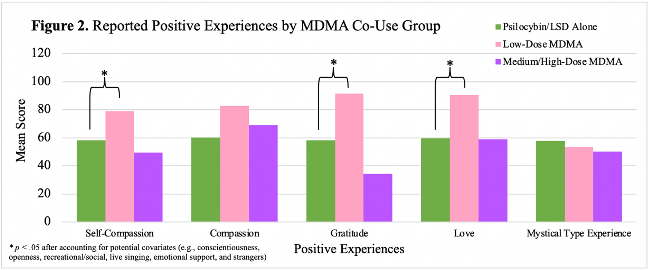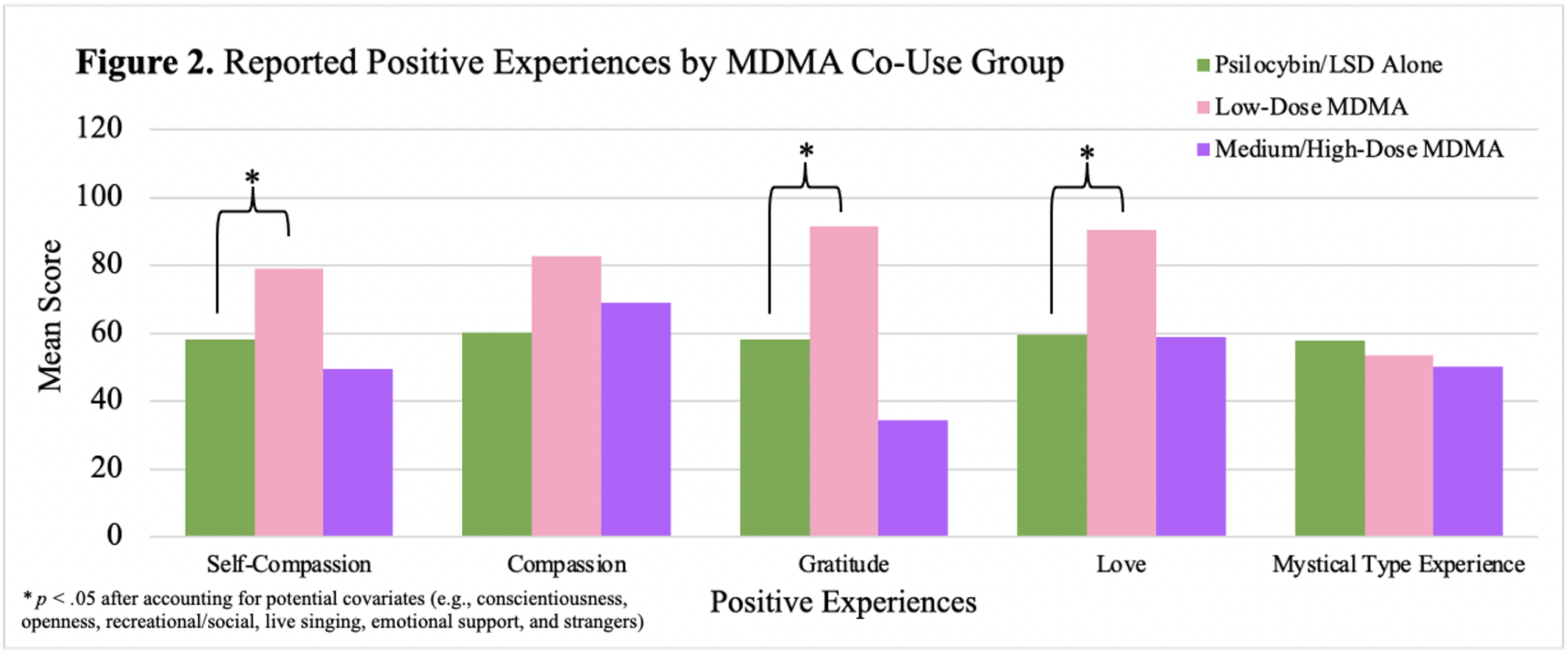 When compared to classic psychedelic use alone, co-use of low-dose MDMA was associated with significantly greater feelings of self-compassion, love, and gratitude. This relationship was not found for co-use of medium-high dose MDMA. Moreover, co-use of any dose of MDMA was not associated with significant differences in compassion or mystical-type experience (Figure 2).