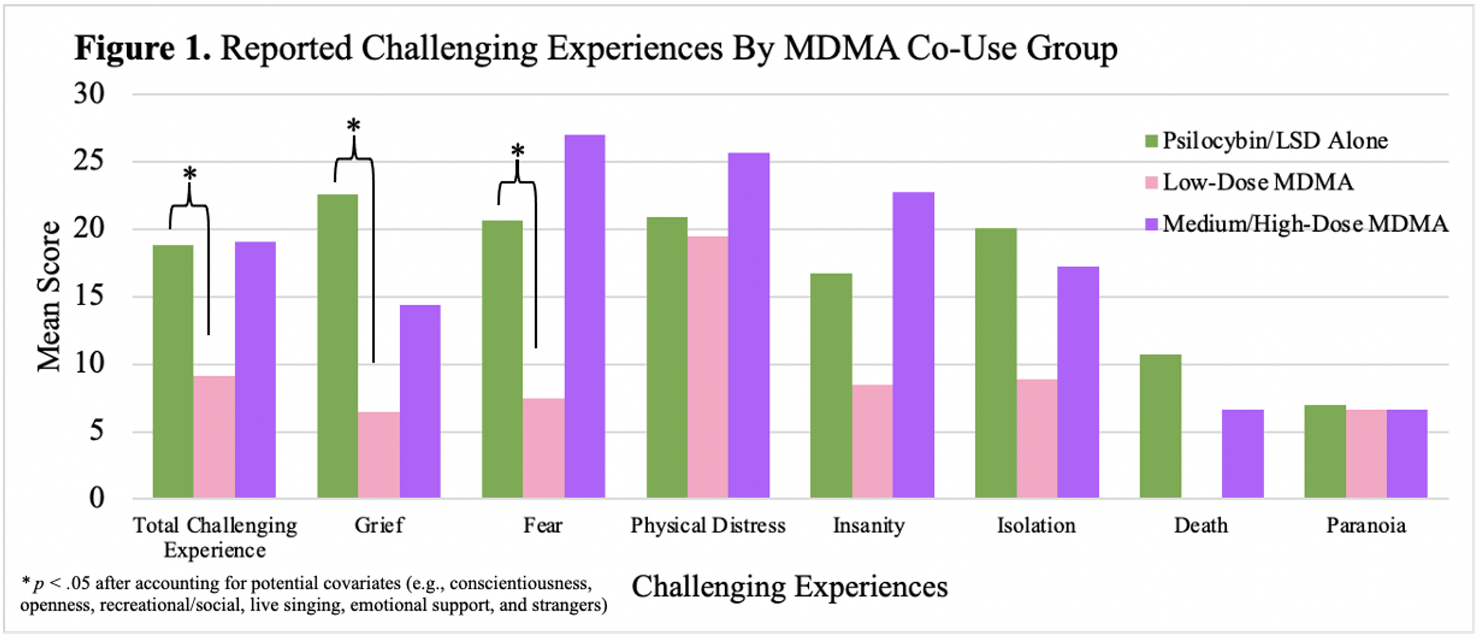 The study found that, relative to classic psychedelics alone, the co-use of low-dose MDMA was associated with significantly less total challenging experiences, grief, and fear during the acute psychedelic experience. In alignment with recent findings, this relationship was not evident when comparing the co-use of medium-high dose MDMA to classic psychedelic use alone. Furthermore, regardless of dose, the co-use of MDMA was not related to significant differences in perceived physical distress, insanity, isolation, death, or paranoia during the acute psychedelic experience (Figure 1).